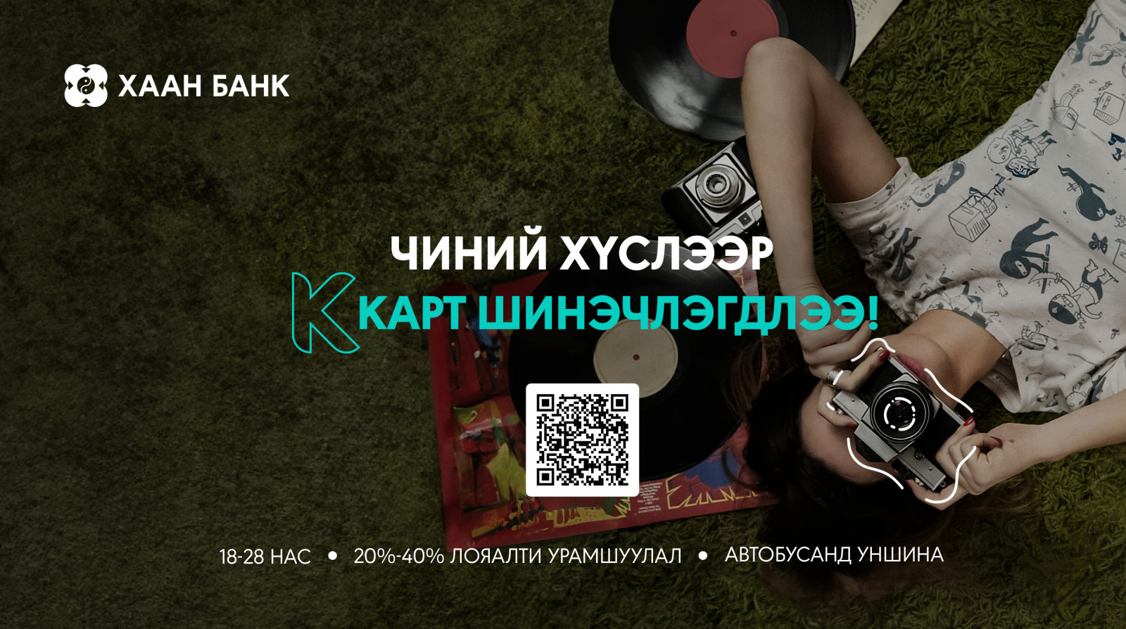 Залууст зориулсан К карт шинэчлэгдэж, илүү олон боломжийг санал болгож эхэлснийг дуулгахад таатай байна. К карттай болсноор банк доторх гүйлгээний шимтгэл, данс хөтөлсний хураамж зэргээс бүрэн чөлөөлөгдөхөөс гадна гишүүнчлэлтэй, буцаан олголттой маш олон лояалти урамшууллууд таныг хүлээж байна. Бас нэгэн гайхалтай мэдээ гэвэл К картыг 18-22 насныхан авах эрхтэй байсан бол насны дээд хязгаарыг нэмж, 28 хүртэлх насны залуус захиалан авах боломж бүрдлээ. Үүнээс гадна ХААН Банк, “Улаанбаатар Смарт Карт” ХХК-тай хамтран, их, дээд сургуулийн бакалаврын түвшний оюутнуудад К картаа уншуулан нийтийн тээврийн хэрэгслээр зорчих боломжийг олгож байна. Оюутан залуус та бүхэн картаа ашиглан сард 44 удаа автобусанд үнэ төлбөргүй зорчих эрхтэй боллоо.