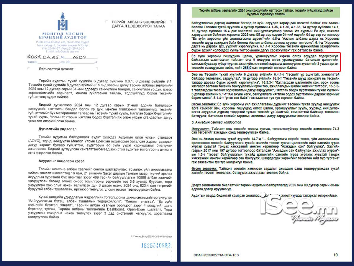 Энэ нь Төсвийн тухай хуулийн 6 дугаар зүйлийн 6.4.1-т “төсвийг үр ашигтай, хэмнэлттэй байхаар төлөвлөж, зарцуулах”, 16 дугаар зүйлийн 16.5-т “Төсвийн шууд захирагч нь төсвийн талаар дараах бүрэн эрхийг хэрэгжүүлнэ”, 16.5.3-т “батлагдсан цалингийн сан, орон тооны хязгаарт багтаан төсвийн байгууллагын орон тоо, ажиллагчдын цалин хөлсийг тогтоох”, 16.5.5- т “батлагдсан төсвийг зориулалтын дагуу зарцуулах”, Нягтлан бодох бүртгэлийн тухай хуулийн 5 дугаар зүйлийн 5.1-т “Аж ахуйн нэгж, байгууллага нягтлан бодох бүртгэлийн дараах зарчмыг баримтална”, 5.1.4-т “үнэн зөв байх” гэж заасныг тус тус зөрчиж байгаа аж.