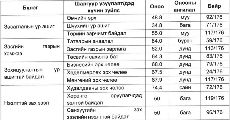 Шалгуур үзүүлэлтүүдийн оноогоор нийт 176 орноос “өмчийн эрх”-ийн үзүүлэлтээр 92-т эрэмбэлэгдэж “муу”, “төрийн зарчимт байдал” үзүүлэлтээр 117-д эрэмбэлэгдэж “муу”, бизнесийн эрх чөлөө” үзүүлэлтээр 119-т эрэмбэлэгдэж “бага” гэж үнэлэгдсэн байна.