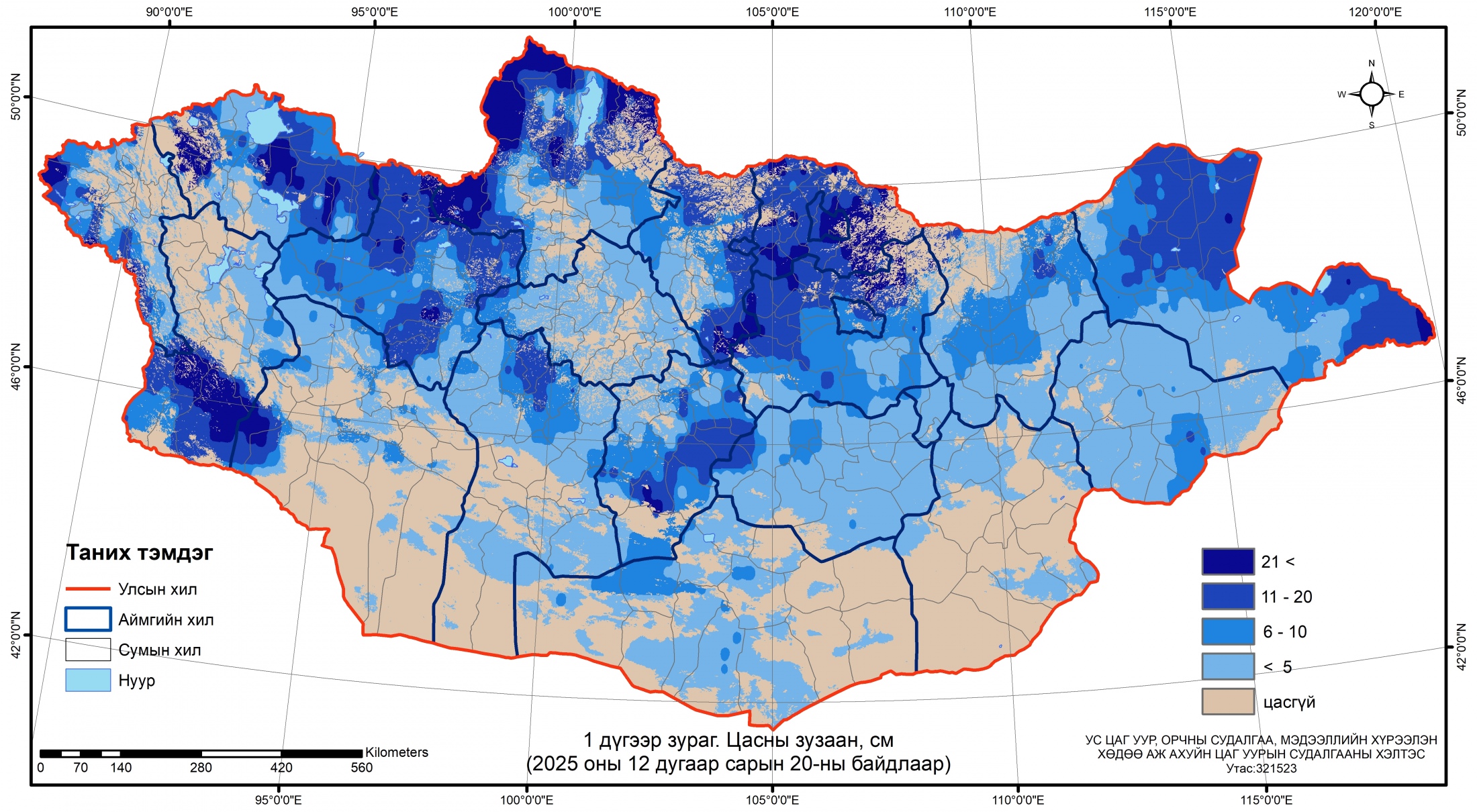 Цаг уурын байгууллагаас арав хоногт нэг удаа хийдэг хээрийн цасны хэмжилтийн мэдээгээр арваннэгдүгээр сарын 20-ны байдлаар нийт нутгийн 79 хувьд цастай байна.
