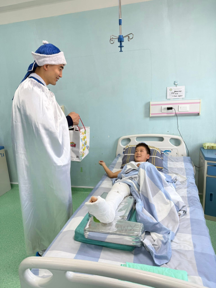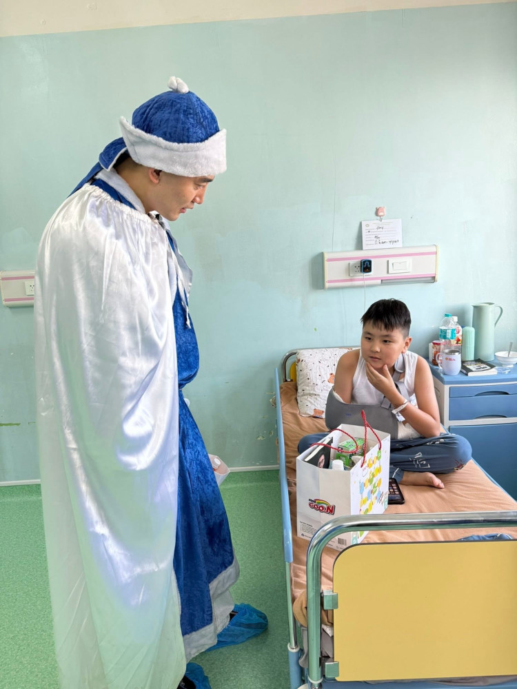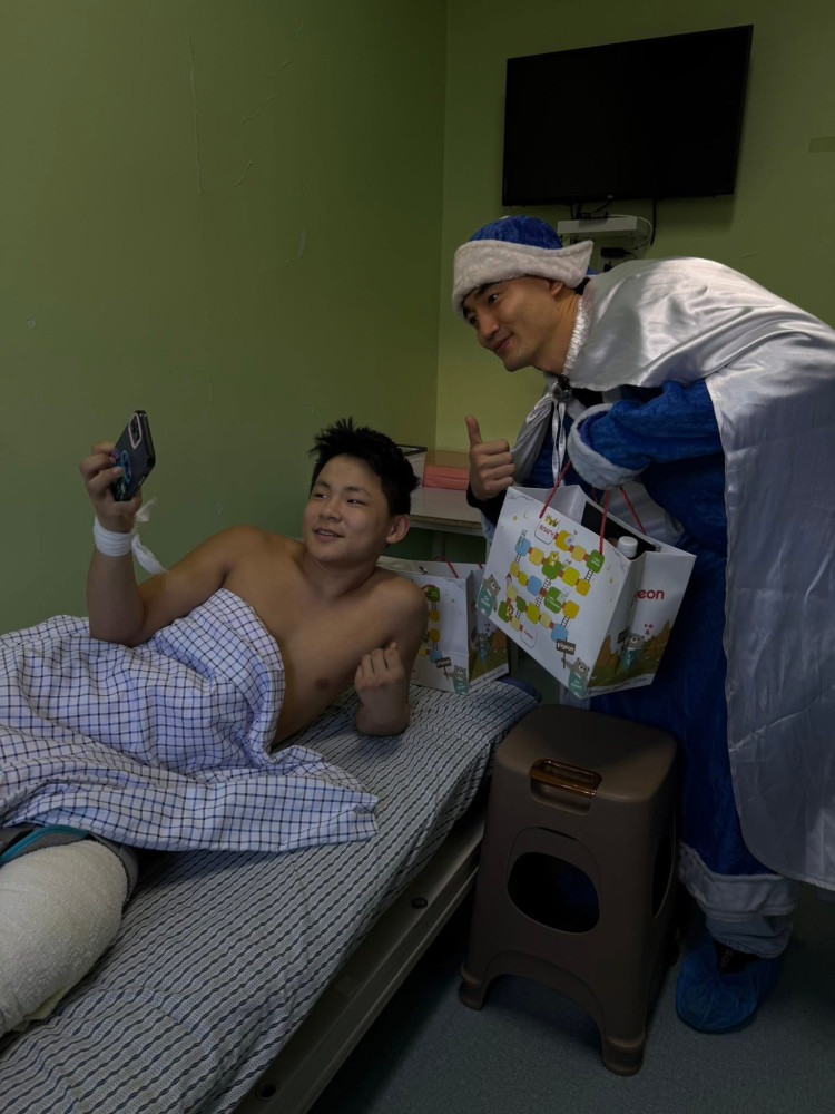 Тэрбээр энэ талаараа, “Эмнэлэг дээр шинэ оноо гаргах мэдээж тийм ч сайхан биш байх. Булчинтай өвлийн өвгөн Гэмтэл Согог Судлалын Үндэсний Төвд эмчлүүлж буй бүх хүүхдүүд дээр зочилж бэлэг өгч, сэтгэл санааг нь сэргээх гэж хичээлээ. Маш сайхан өдөр байлаа. Эмч нартаа баярлалаа. Хүүхдүүд минь хурдан эдгээрэй” гэжээ.