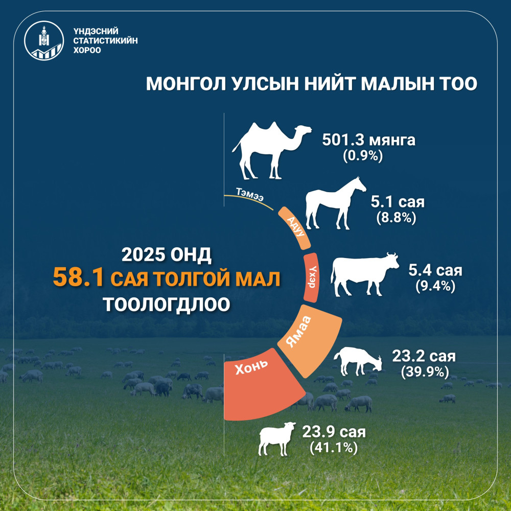Улсын хэмжээнд 2025 оны эцэст мал тооллогын урьдчилсан дүнгээр 58.1 сая толгой мал тоологдсон байна. Энэ нь малын тоо өмнөх оноос 445.1 мянган толгойгоор буюу 0.8 хувиар өссөн үзүүлэлт болжээ.