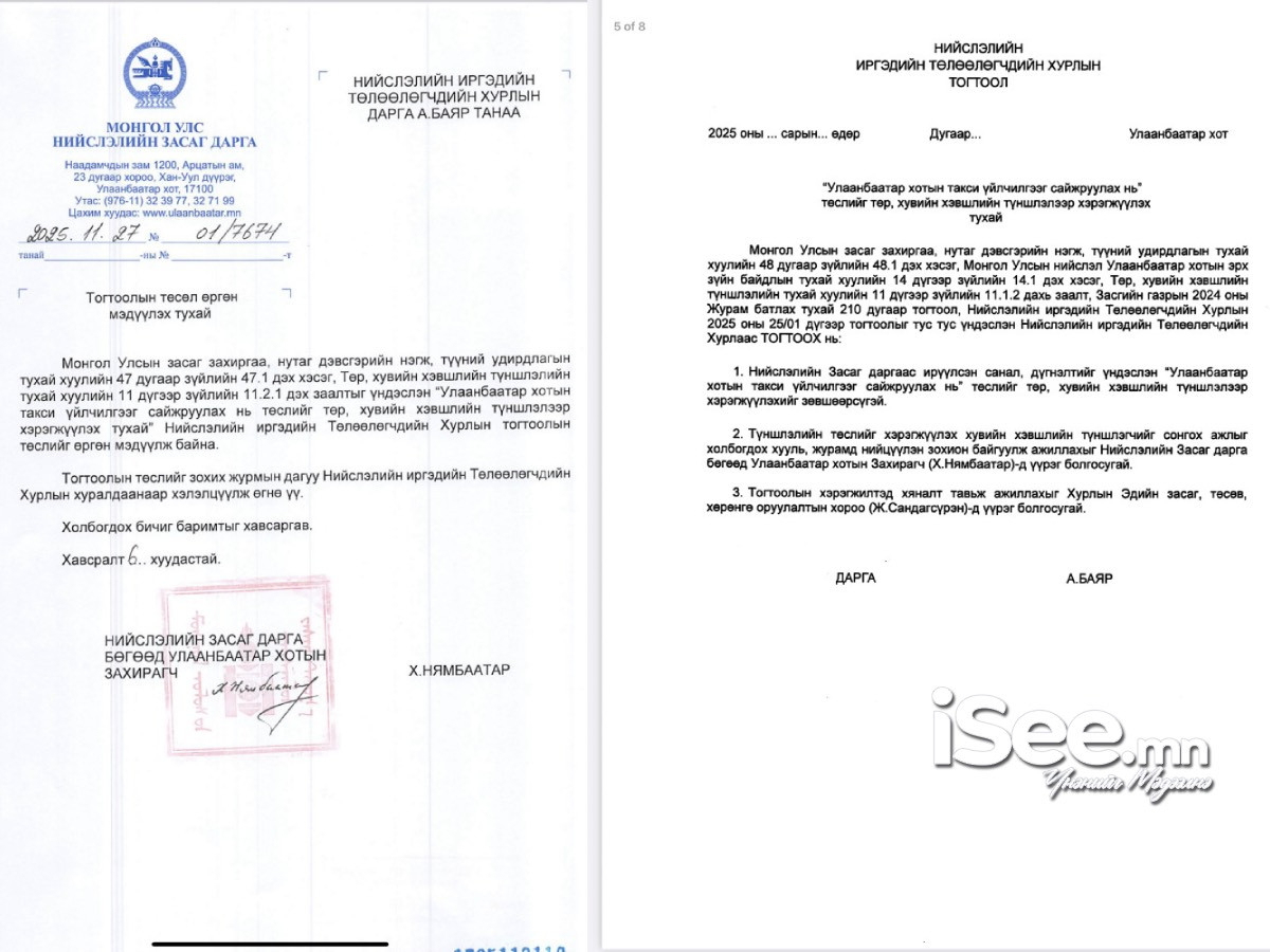 Нийслэлийн засаг дарга Х.Нямбаатарын Улаанбаатар хотын такси үйлчилгээг төр, хувийн хэвшлийн түншлэлээр сайжруулах тухай тогтоолын төсөл санаачилж өргөн мэдүүлсэн. Энэ төсөлд дурдсанаар цахилгаан хөдөлгүүртэй 2000 автомашиныг таван жилийн хугацаанд авч, нэгдсэн удирдлагын системд холбож, үйлчилгээнд явуулах тухай заасан байгаа юм. Ингэхдээ нийслэлээс нийт 77 тэрбум төсөвлөсөн байх бөгөөд 74 хувь буюу 56 тэрбум төгрөгийг 16.5 хувийн хүүтэй бизнесийн зээлээр авахаар тооцож, 26 хувийн санхүүжилтийг нь буюу 21 тэрбум төгрөгийг Нийслэлийн нийтийн тээврийг хөгжүүлэх сангаас хүүгүй, 6 жилийн хугацаанд эргэн төлөгдөх нөхцөлтэйгөөр зээлэхээр уг төсөлд тусгасан байна. Мөн хувийн хэвшлийн түншлэгчээр шалгарсан такси үйлчилгээ эрхлэгчид нь аж ахуйн буюу баазын системээр нийтийн тээврийн үйлчилгээнд мөрдөгдөх, дүрэм журмын дагуу үйл ажиллагаа явуулна гэж дурдсан байна.