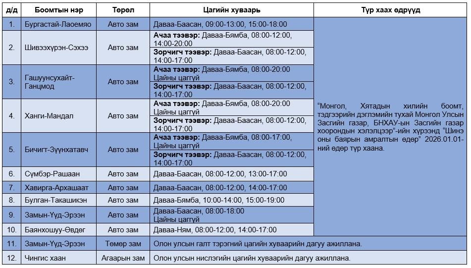 Монгол-Хятадын хилийн боомтуудын 2026 оны нэгдүгээр сард ажиллах цагийн хуваарийг хүргэж байна.