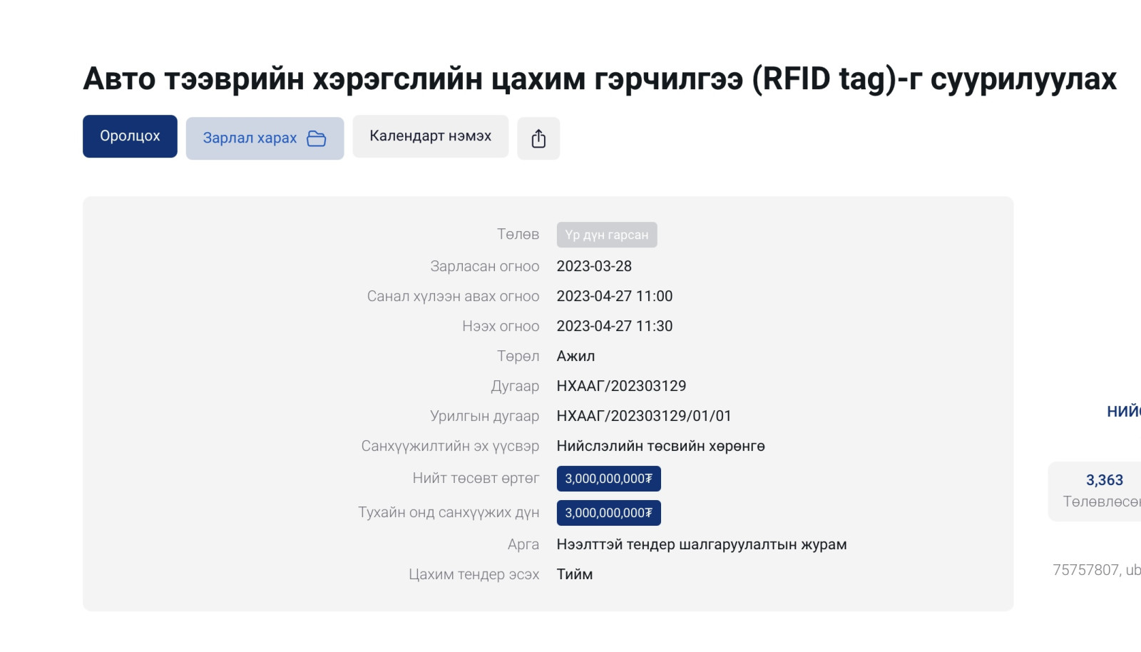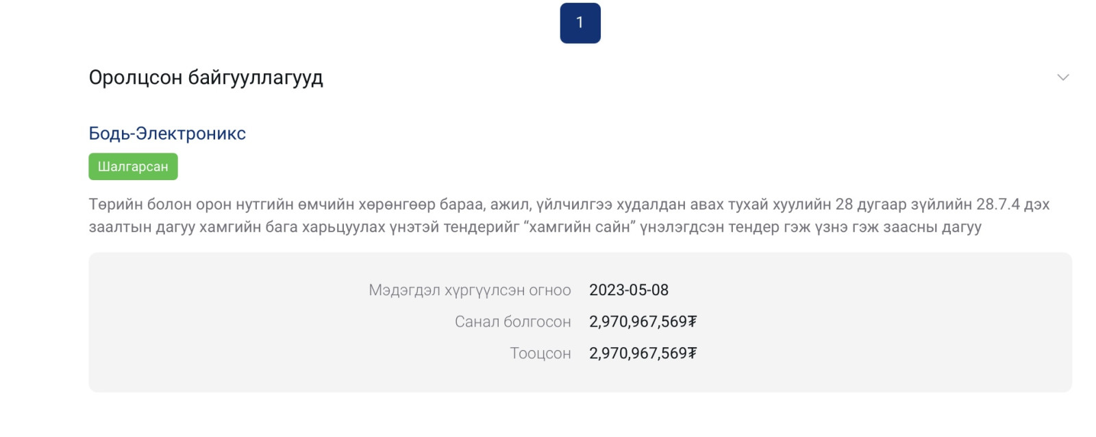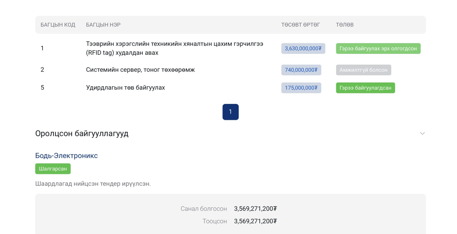 Нийслэлийн төсвийн хөрөнгөөс гурван тэрбум төгрөгийн санхүүжилттэй уг тендер 2.97 тэрбумын саналаар “Бодь-Электроникс” компани ганцаараа оролцож, өрсөлдөгчгүй шалгарсан.