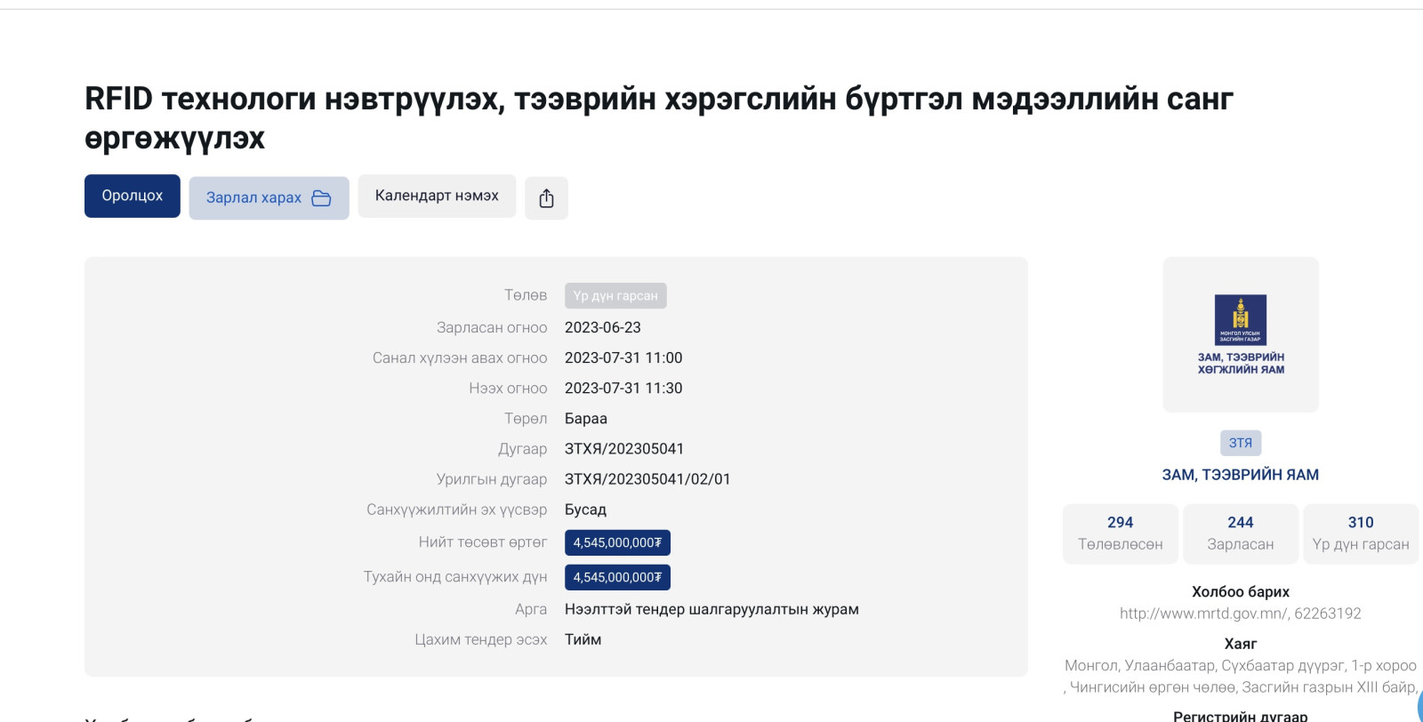 Мөн Зам, тээврийн хөгжлийн яамнаас “RFID технологи нэвтрүүлэх, тээврийн хэрэгслийн бүртгэлийн мэдээллийн санг өргөжүүлэх” тендерийг 2023 оны зургадугаар 23-наас долдугаар сарын 31-ыг хүртэл зарлажээ. Ингэхдээ 4.5 тэрбум төгрөгийн санхүүжилттэй гурван багц тендер зарласан. Эхний буюу нэгдүгээр багцын 3.6 тэрбум төгрөгийн санхүүжилттэй тендерт уБодь” мөн л ганцаараа орж, өрсөлдөгчгүйгээр ялалт байгуулжээ. Ингээд “RFID” цахим гэрчилгээг автомашинуудад байршуулсан ч энэ нь ямар ч үр дүнгүй, төсвийн мөнгийг дэмий зарцуулсан ажил болоод дууссан.