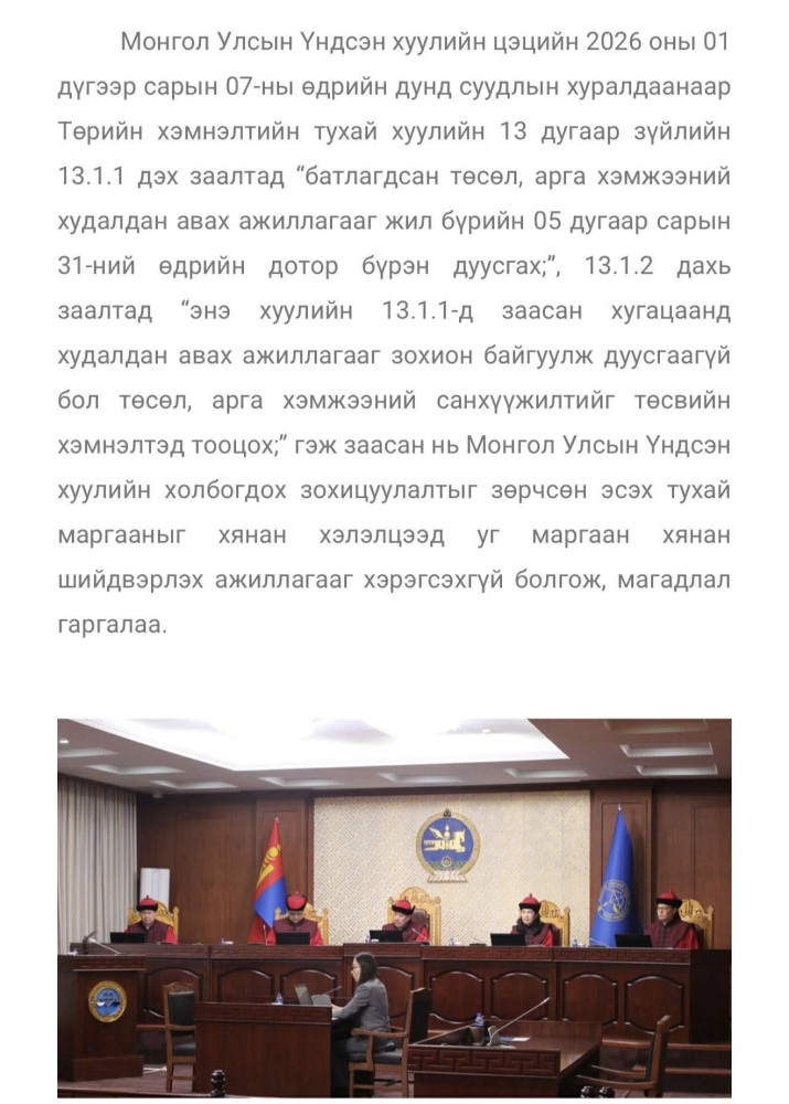 Тэгвэл хэмнэлтийн тухай хуулийн энэ заалт нь хүүхдийн сурч боловсрох эрхийг зөрчиж байна хэмээн НЗД-ын орлогч А.Амартүвшин Үндсэн хуулийн цэцэд ханджээ. Улмаар тус гомдлыг Үндсэн хуулийн цэц 2026 оны 01 дүгээр сарын 07-ны өдөр хэлэлцэж, хүүхдийн сурч боловсрох үндсэн эрхэд халдаагүй гэх шийдвэрийг гаргасан байна. Энэ тухай НЗД-ын орлогч А.Амартүвшин "Ширээ сандал хүрэлцэхгүй, агааржуулалтгүй анги танхимд 60-80 хүүхэд сууж суралцах нь эрүүл аюулгүй орчин гэж Үндсэн хуулийн цэц үзлээ. Хүүхдүүд өвдсөн үедээ эмнэлгийн коридорт хэвтэх нь эрүүл, аюулгүй орчинд өсөн торниж байна гэжээ. Хамгийн гол нь Үндсэн хуулиар хугацаагүй олгосон эрхийг “Хэмнэлтийн тухай” хуулиар хугацаа тогтоож буйг Үндсэн хууль зөрчсөн үйлдэл гэж миний бие үзэж байна" хэмээн байр сууриа илэрхийлжээ.