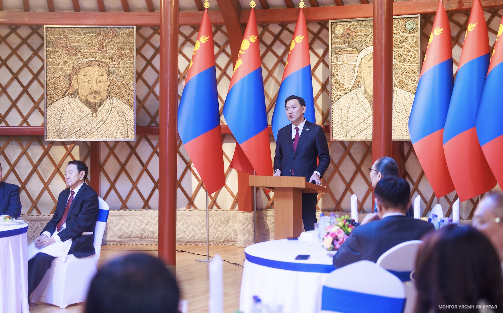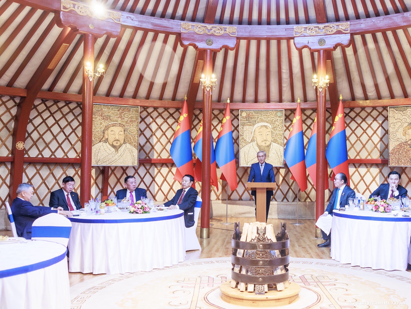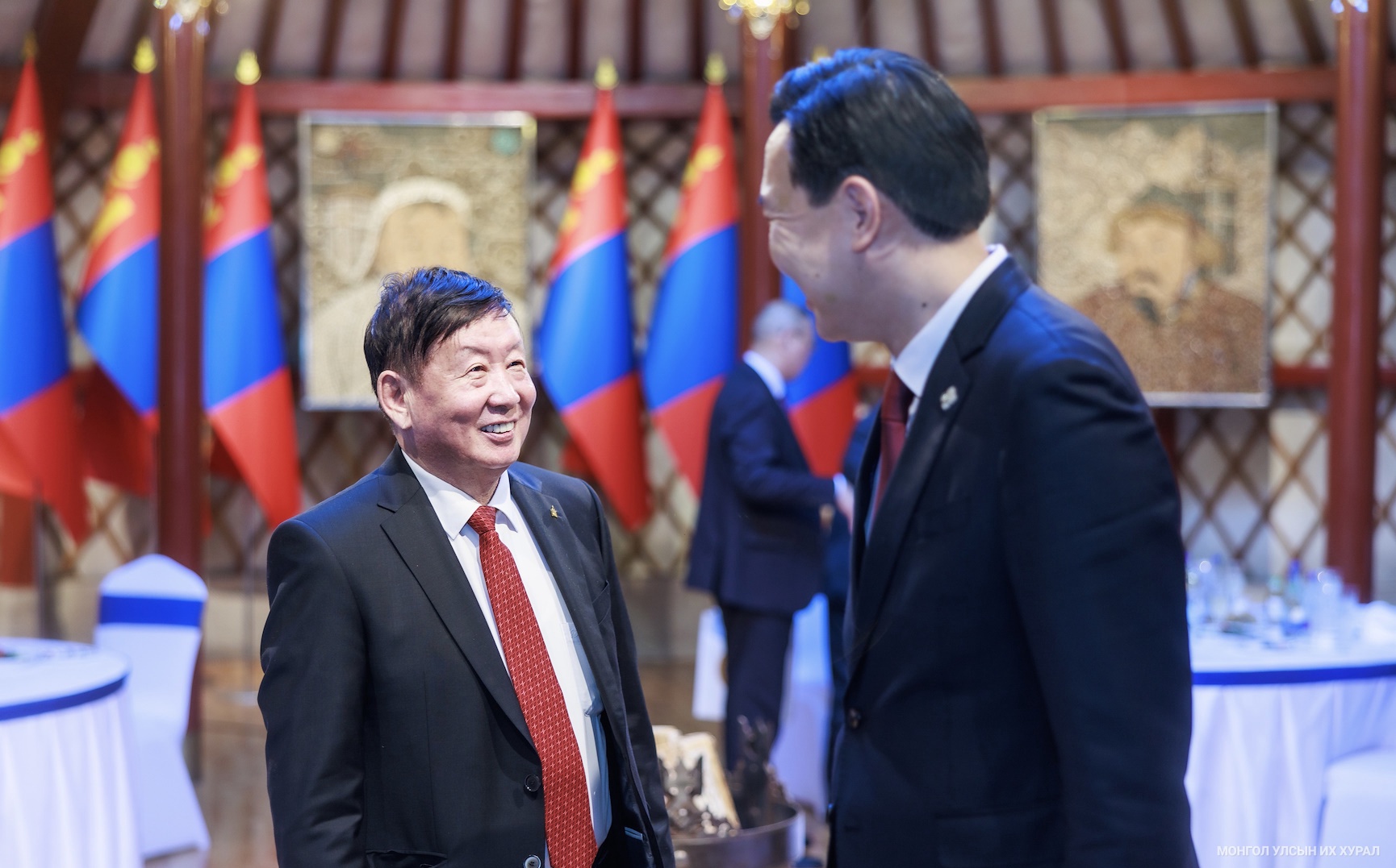 Төрийн ёслол хүндэтгэлийн өргөө цогцолборт болсон хүндэтгэлийн уулзалтын эхэнд Улсын Их Хурлын дарга Н.Учрал, эрхэм зочдод Монгол Улсын Үндсэн хуулийн түүхт 34 жилийн ойн өдрийн мэндийг дэвшүүлэв.