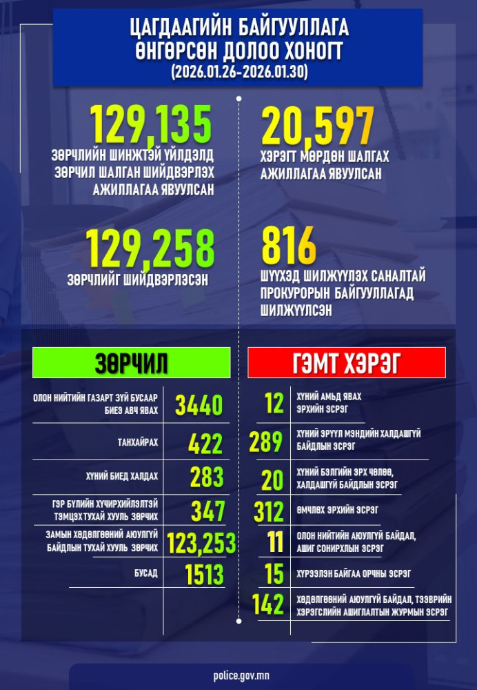 Цагдаагийн байгууллагаас өнгөрсөн долоо хоногт 20.597 хэрэгт мөрдөн шалгах ажиллагааг явуулж, 816 хэргийг шүүхэд шилжүүлэх саналтай прокурорын байгууллагад хүргүүлсэн байна.