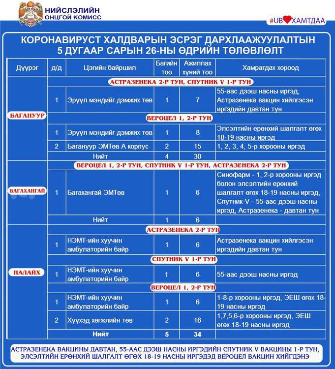 Өнөөдөр /2021.05.26/ нийтийн амралтын өдөр хэдий ч дархлаажуулалтын цэгүүд 09:00-17:00, PCR шинжилгээний зургаан цэг 09:00-12:00 цагийн хооронд нийслэлийн төвийн зургаан дүүрэгт суурин 3, явуулын 3 шинжилгээний цэг ажиллана.