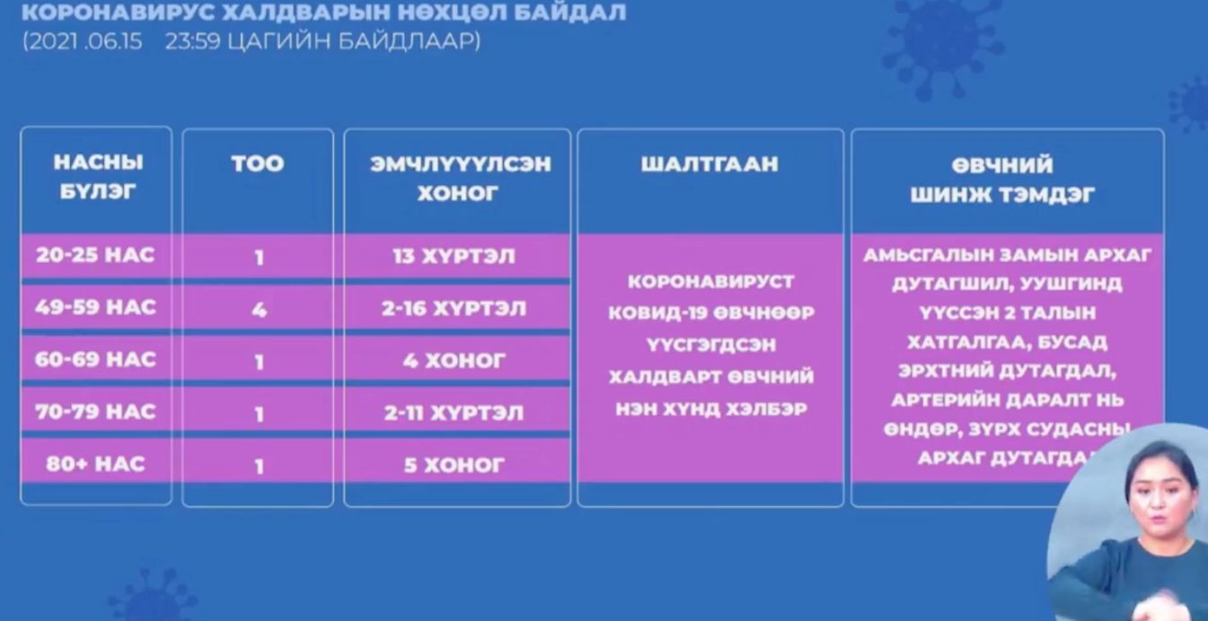 Эдгээр нас барсан хүмүүсийн дотор вакцин хийлгээгүй байсан 22 настай залуухан хүний биеийн байдал хүндэрч, коронавирус халдварын нэн хүнд хэлбэрээр нас барсан гэдгийг онцлов.