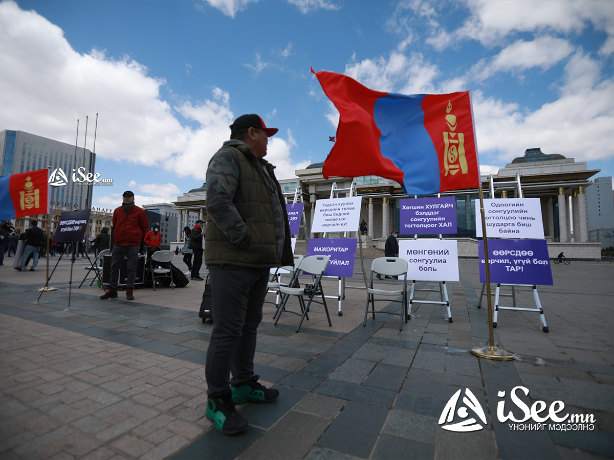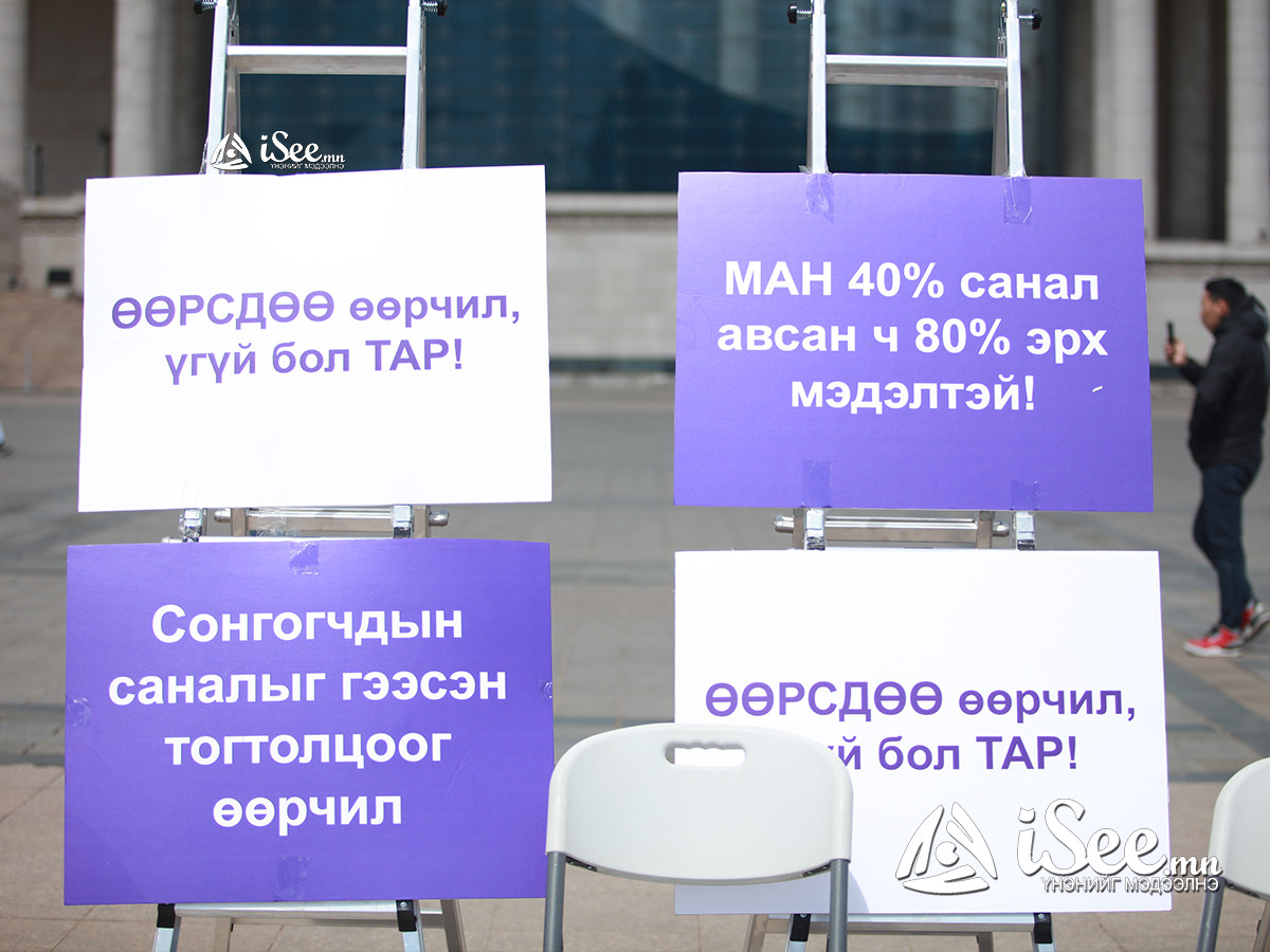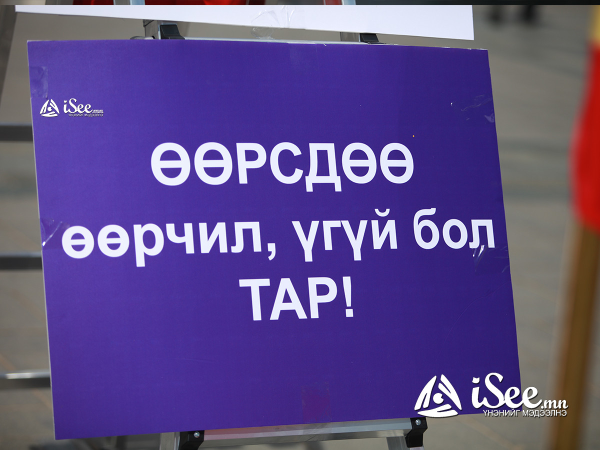 УИХ-ын гишүүн Т.Доржхандын санаачилсан "Өөрсдөө өөрчил, үгүй бол ТАР" жагсаал Төв талбайд болж байна. Жагсагчид УИХ-аас тогтолцоогоо өөрчлөхийг шаардаж, иргэдээс гарын үсэг цуглуулахаар ийнхүү жагсаал зохион байгуулж байгаа юм.