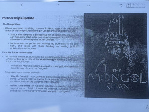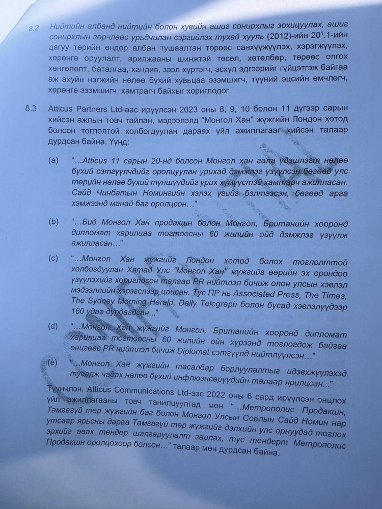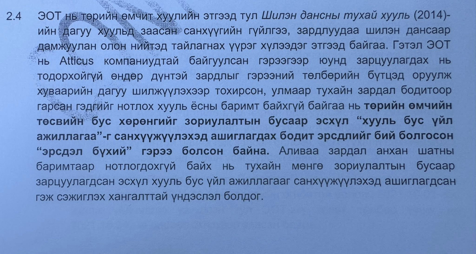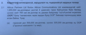Нэг. Эрдэнэс-Оюу толгой компани нь Л.Оюун-Эрдэний Засгийн газрын “шийдвэр”-ийн дагуу гэдэг нэрийдлээр гадаад улсын Atticus Partners Ltd болон Atticus communications Ltd компанитай 4 удаагийн үйлдлээр нийт 1.9 сая ам доллараар (7 орчим тэрбум төгрөг) гэрээ хийж “дэлхийд Монголыг сурталчлах” гэсэн халхавчаар Монгол улсын Ерөнхий сайд асан Л.Оюун-Эрдэний 50 хувь эзэмшдэг Херо энтертэйнмент компаний бүтээл “Монгол хаан” жүжгийн гадаад суртачилгааг хийсэн нь баримтаар тогтоогдов.