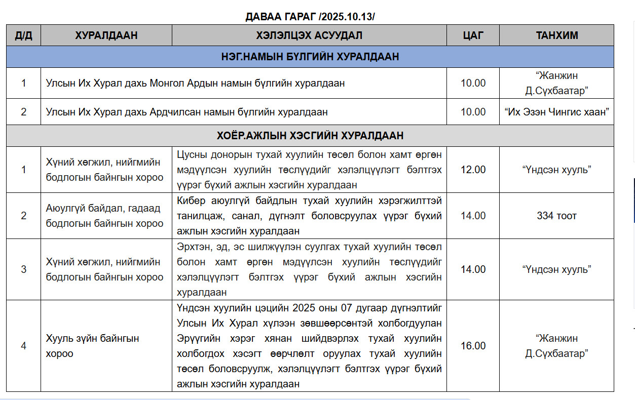 Харин маргааш /2025.10.13/ Хууль зүй байнгын хороо, Хүний хөгжил нийгмийн бодлогын байнгын хороо, Аюулгүй байдал, гадаад бодлогын байнгын хороо болон УИХ дахь намын бүлгүүд хуралдах тов гараад байна.
