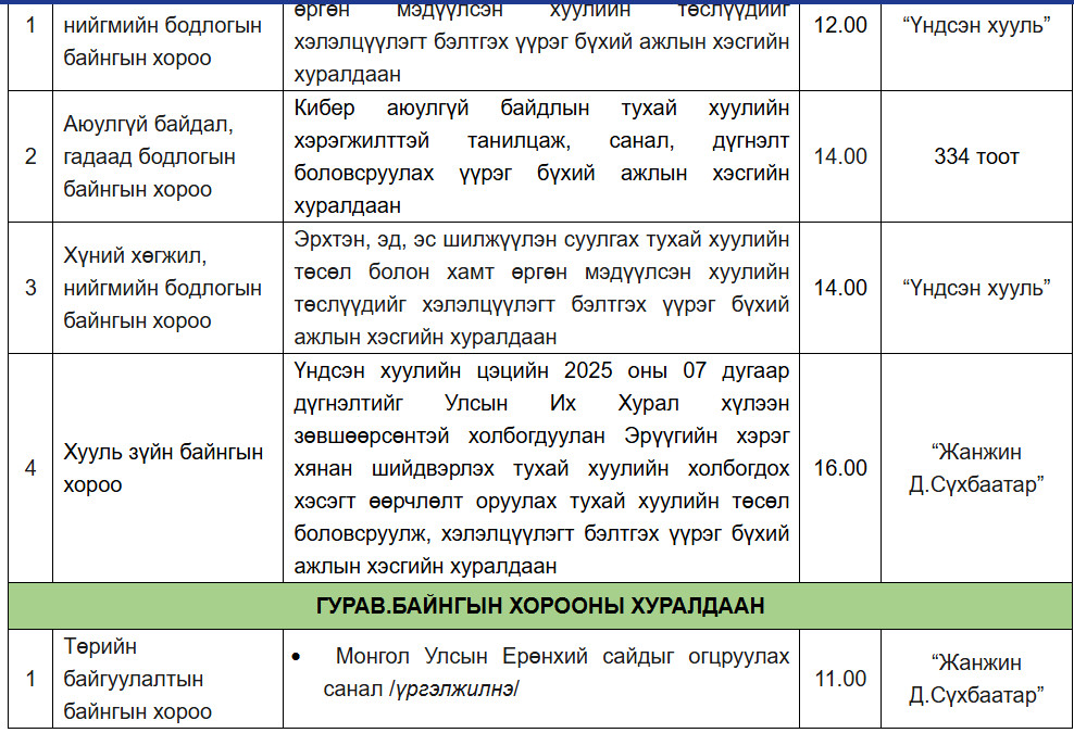 Улсын их хурлын 2025 оны намрын ээлжит чуулганы ирэх долоо хоногийн хуралдаанаар хэлэлцэх асуудлын тов, дарааллыг шинэчилжээ. Улмаар Монгол улсын ерөнхий сайд Г.Занданшатарыг огцруулах саналыг хэлэлцэх Төрийн байгуулалтын байнгын хорооны хуралдааныг маргааш /20255.10.12/ 11 цагт товлосон байна.