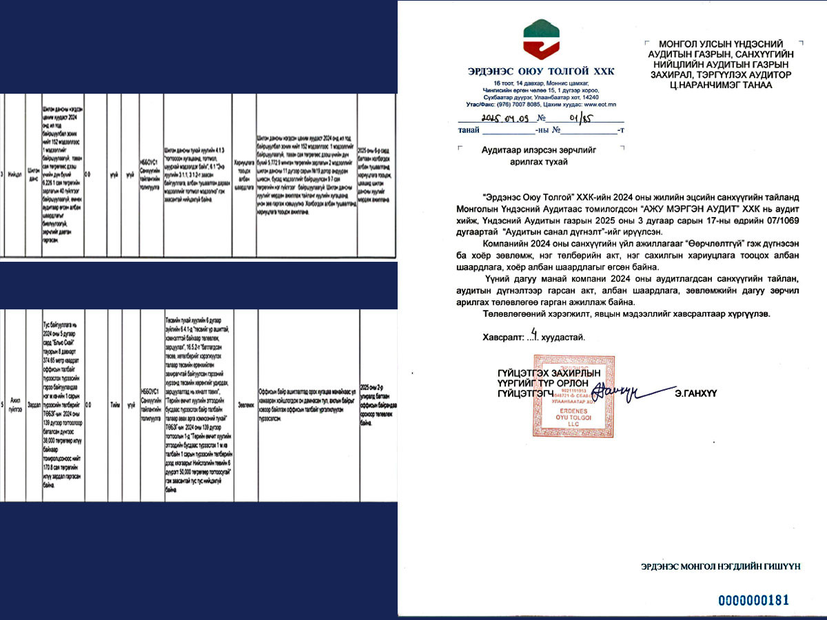 Тодруулбал, тухайн компани нь үйл ажиллагааны зардлыг санхүүжүүлэх зорилгоор толгой компани буюу "Эрдэнэс Монгол" ХХК-иас 2012-2021 оны хугацаанд авсан үндсэн зээл, хуримтлагдсан зээлийн хүүгийн төлбөрт 12 тэрбум гаруй төгрөгийн өртэй байгаа нь ил болсон байна. Энэ нь тус компанийн төлбөрийн чадварыг илэрхийлэх санхүүгийн үзүүлэлтүүдийн зохистой харьцаа алдагдсан байгааг илэрхийлж байгаа аж.