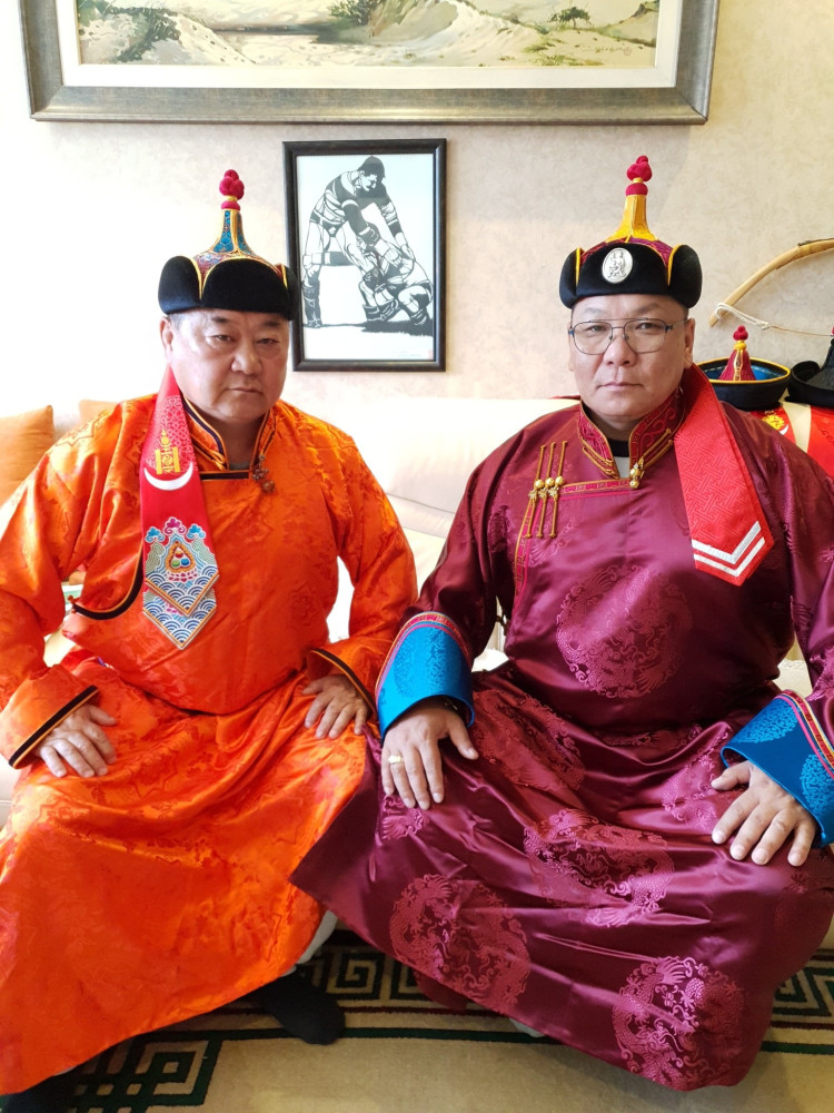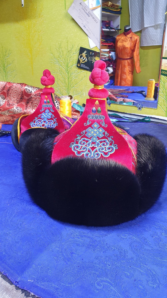 -Энэ хоёр малгай бол Улсын харцага О.Мөнх-Эрдэнийн захиалга. Гэхдээ өөртөө биш. Өвөр Монгол хоёр бөх найз нь хийлгэж байгаа гэсэн. Улсын арслан Ц.Бямба-Отгоны хийлгэсэн загвараар хийлгэнэ гэж захиалга өгсөн. Ер нь нэг малгайг 3-4 хоногт оёж дуусгадаг. Харин энэ хоёр малгайг яаралтай захиалга гээд хоёр хоногт дуусгах гээд оёж байна.