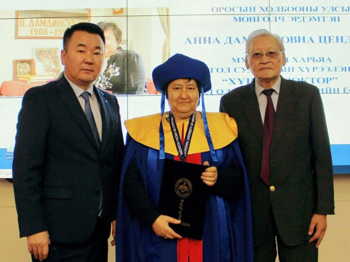 МУИС-ийн харьяа Монгол судлалын хүрээлэнгийн "Хүндэт доктор” цол олгох журам, Эрдмийн зөвлөлийн хурлын шийдвэрийг үндэслэн Монгол Улсын түүх, соёлыг судлах, монгол судлалыг хөгжүүлэхэд оруулсан хувь нэмрийг үнэлж Оросын Холбооны Улсын монголч эрдэмтэн Анна Дамдиновна Цендина-д МУИС-ийн харьяа Монгол судлалын хүрээлэнгийн “Хүндэт доктор” цол олголоо.