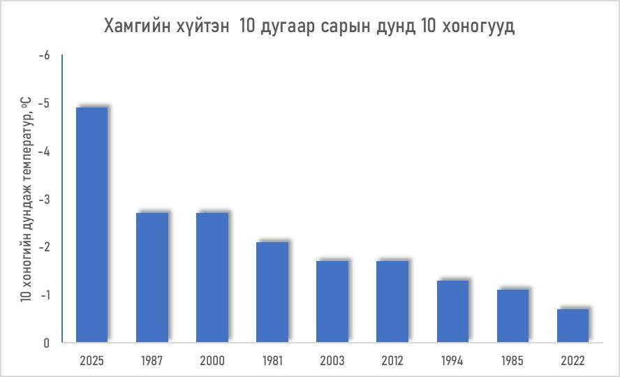 Энэ оны аравдугаар сарын дунд 10 хоногийн /2025.10.11-20/ агаарын дундаж температур +2 градус дулаан байдаг бол энэ жил дундаж температур -6.9 градусаар хүйтэн буюу -4.9 градус байжээ. Энэ нь 1981 оноос хойших хамгийн хүйтэн 10 хоног болсон гэж Цаг уур орчны шинжилгээний газраас мэдээллээ.
