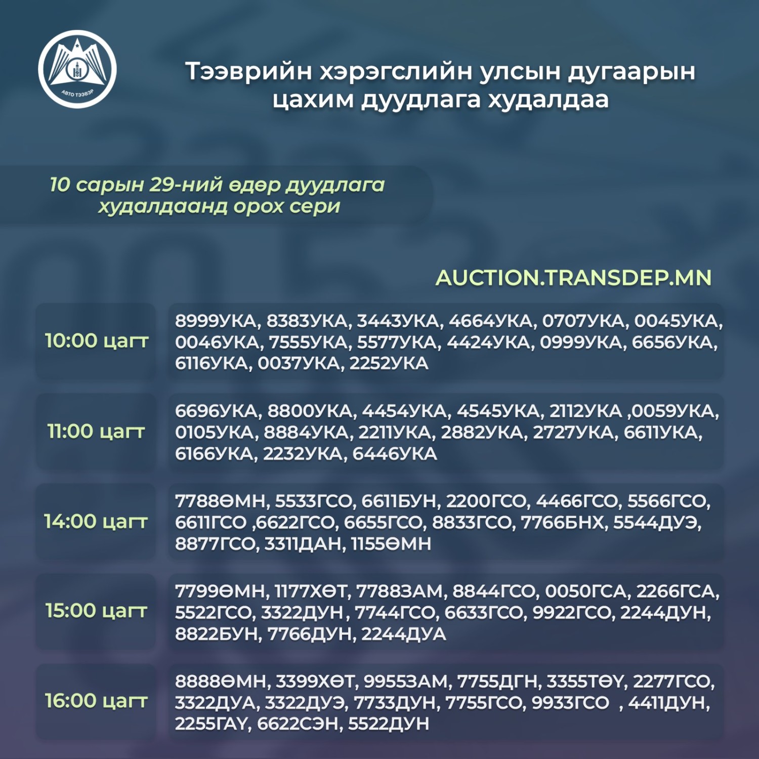 Өнөөдөр Автотээврийн Үндэсний Төвөөс тээврийн хэрэгслийн улсын дугаарын цахим дуудлага худалдаа зохион байгуулах бөгөөд дараах дугааруудыг худалдана.
