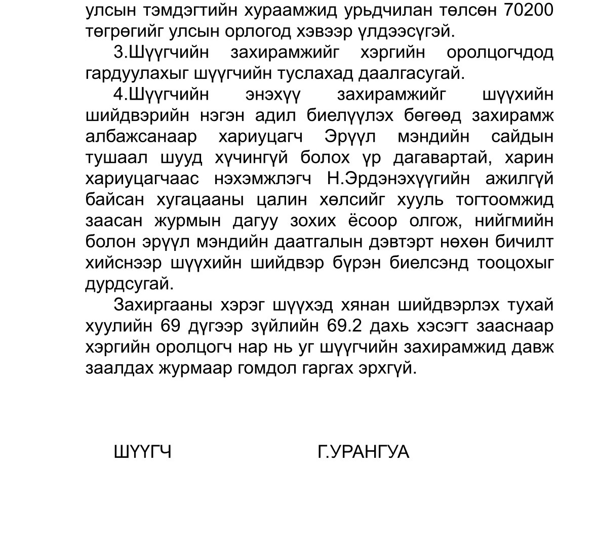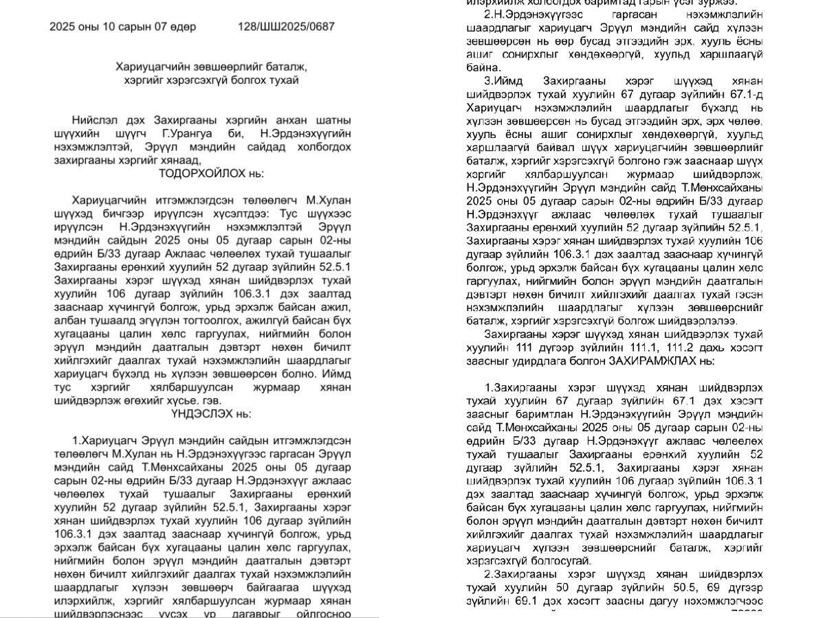 Угтаа бол тус шүүхээс хянан шийдвэрлэх ажиллагааг явуулалгүй эвлэрлийг баталгаажуулж захирамж гаргажээ. Тэгэхээр Т.Мөнхсайханы шийдвэрийг шүүх хүчингүй болгосон гэдэг нь ташаа мэдээлэл аж. Мөн өөрсдийнх нь тайлбар ч худал болох нь доорх баримтаас харагдаж байна. Тодруулбал, Ж.Чинбүрэн нь Эрүүл мэндийн сайдаар очингуутаа тус гомдол дээр өөрийнхөө итгэмжлэгдсэн төлөөлөгчөөр М.Хулан гэж магадгүй яамны ажилтнаа томилж ажиллуулсан байна. Харин М.Хулан нь шүүхэд бичгээр хүргүүлсэн хүсэлтдээ: Тус шүүхээс ирүүлсэн Н.Эрдэнэхүүгийн нэхэмжлэлтэй Эрүүл мэндийн сайдын 2025 оны 05 дугаар сарын 02-ны өдрийн Б/33 дугаар Ажлаас чөлөөлөх тухай тушаалыг Захиргааны ерөнхий хуулийн 52 дугаар зүйлийн 52.5.1 Захиргааны хэрэг шүүхэд хянан шийдвэрлэх тухай хуулийн 106 дугаар зүйлийн 106.3.1 дэх заалтад зааснаар хүчингүй болгож, урьд эрхэлж байсан ажил, албан тушаалд эгүүлэн тогтоолгох, ажилгүй байсан бүх хугацааны цалин хөлс гаргуулах, нийгмийн болон эрүүл мэндийн даатгалын дэвтэрт нөхөн бичилт хийлгэхийг даалгах тухай нэхэмжлэлийн шаардлагыг хариуцагч бүхэлд нь хүлээн зөвшөөрсөн болно. Иймд тус хэргийг хялбаршуулсан журмаар хянан шийдвэрлэж өгөхийг хүсье гэжээ.