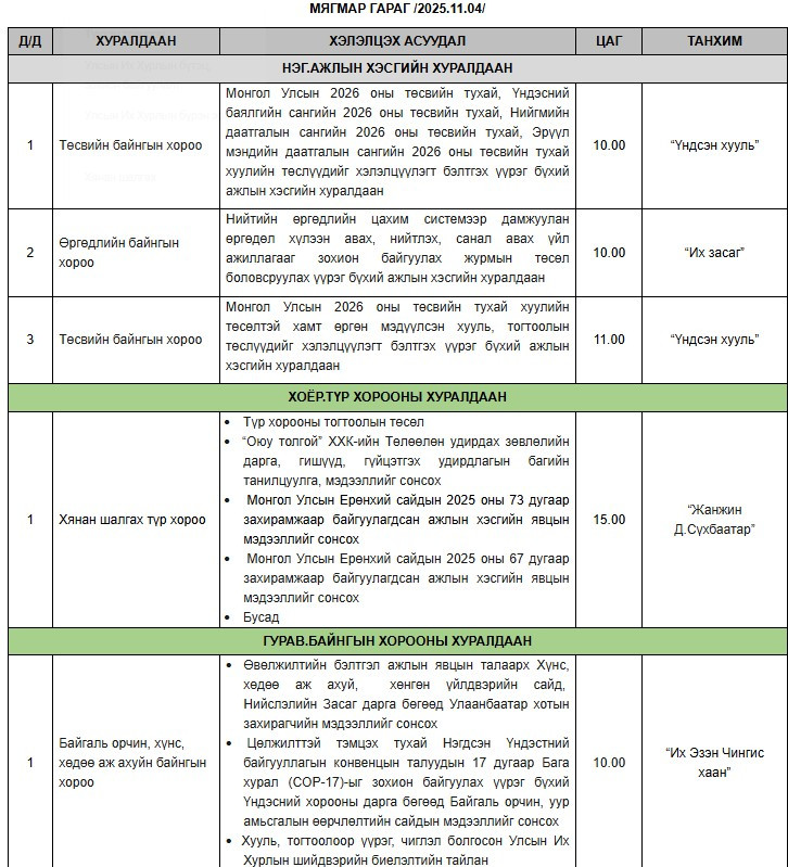 Хуваарийн дагуу өнөөдөр /2025.11.04/ УИХ-ын байнгын хороод хуралдаж энэ долоо хоногт чуулганы хуралдаанаар хэлэлцэх асуудлаар санал дүгнэлтээ гаргана.