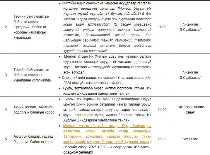 Тодруулбал, Төсвийн байнгын хорооны хуралдаанаар 2026 оны төсвийг, Төрийн байгуулалтын байнгын хорооны хуралдаанаар УИХ-ын 2025 оны намрын ээлжит чуулганаар хэлэлцэх асуудлын жагсаалтад ороогүй хууль, тогтоолын төслүүдийг чуулганаар хэлэлцүүлэх эсэх асуудал, Олон нийтийн радио, телевизийн Үндэсний зөвлөлийн 2024 оны үйл ажиллагааны тайлан зэргийг хэлэлцэх аж.
