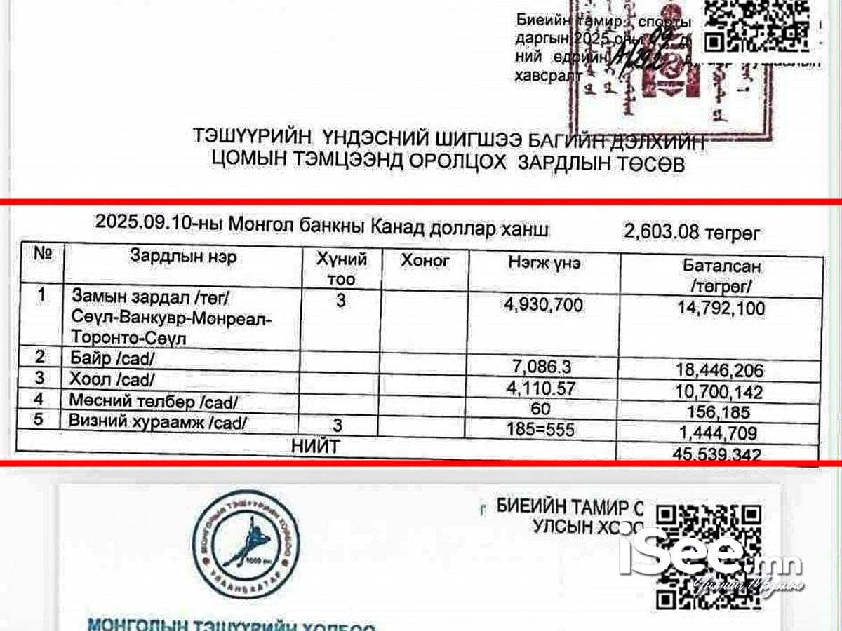 Улмаар 10-р сарын 06-20-ны өдрүүдэд Канад улсад болсон Дэлхийн цомын тэмцээнд гурван хүн явсан хэмээн 45 сая төгрөг батлуулж авсан байна. Тэр нь болохоор ОУХМ Э.Мөнх-Эрдэнэ, дасгалжуулагч Б.Бат-Оргил, ОУХМ Б.Гэрэлтуяа гэсэн гурван хүний төсөв. Гэтэл нэг л хүн тус тэмцээнд явсан. Угаасаа л тамирчин Б.Гэрэлтуяа дэлхийн цомын эрх хийгээгүй учраас тус тэмцээнд оролцох эрхгүй байсан шүү дээ.