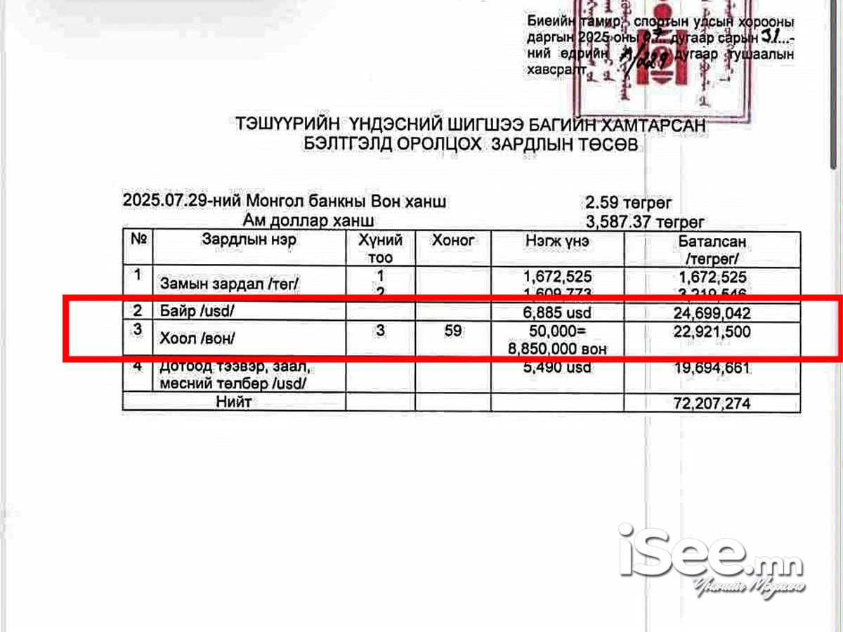 БНСУ-д наймаас есөн сар хүртэл хийсэн хамтарсан бэлтгэлийн үеэр хоол, байрны зардалд гэхэд 20 гаруй сая төгрөг төсөвлөж авсан байна. Гэтэл хүүхдүүд маань Солонгос дасгалжуулагчийнхаа хажуу өрөөнд байрлаж, хоолоо иддэг байсан. Хүүхдүүд минь хүндийн бэлтгэлтэй үед хоолоо ч хангалттай сайн идэж чадахгүй байсан. Зарим үед шигшээ багийн тамирчдыг "Мөнгө хүрэлцэхгүй байна, яасан их иддэг юм" гээд хоолны зардлын мөнгө хасаж байсан удаатай.