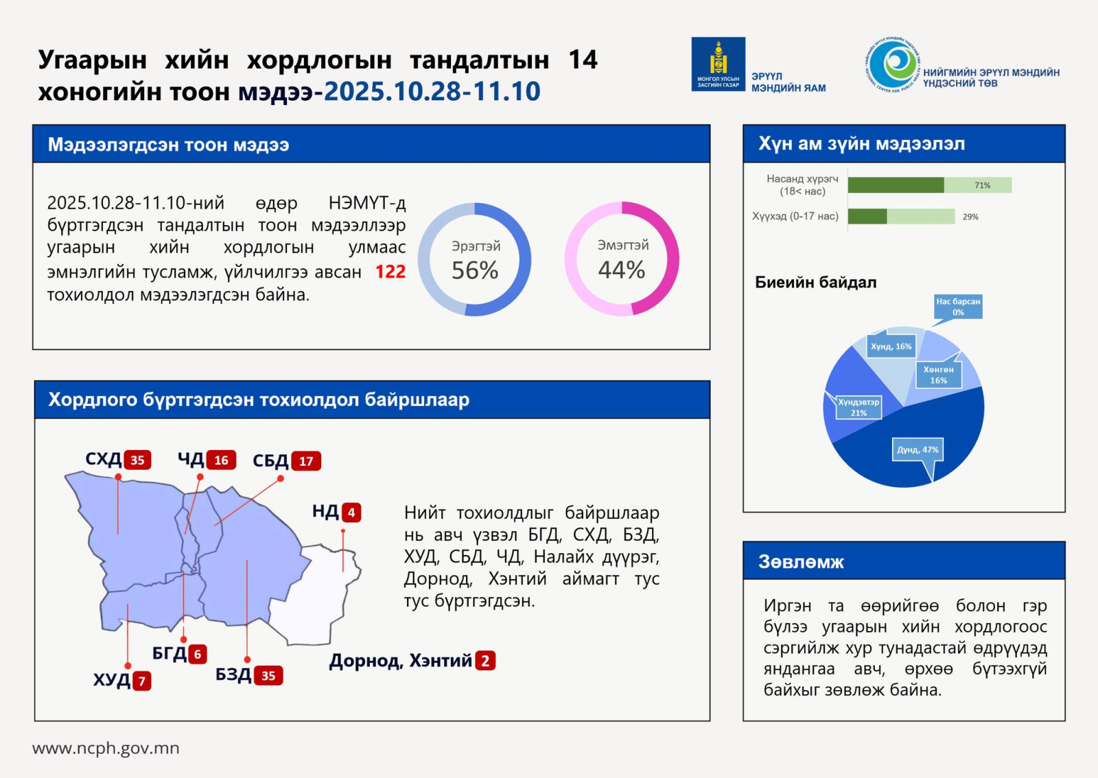 Угаарын хийн хордлогод өртсөн иргэдийг байршлаар авч үзэхэд нийслэлийн Сонгинохайрхан дүүрэгт 35, Чингэлтэй дүүрэгт 16, Сүхбаатар дүүрэгт 17, Хан-Уул дүүрэгт 7, Баянзүрх дүүрэгт 35, Баянгол дүүрэгт 6 бүртгэгдсэн бол алслагдсан дүүрэг болох Налайхад дөрөв бүртгэгджээ. Мөн Дорнод, Хэнтий аймагт угаарын хийд хордсон гэх мэдээлэл бүртгэгдсэн байна. Иймд, иргэн та өөрийгөө болон гэр бүлээ угаарын хийн хордлогоос сэргийлж хур тунадастай өдрүүдэд яндангаа авч, өрхөө бүтээхгүй байхыг НЭМҮТ-ээс зөвлөж байна.