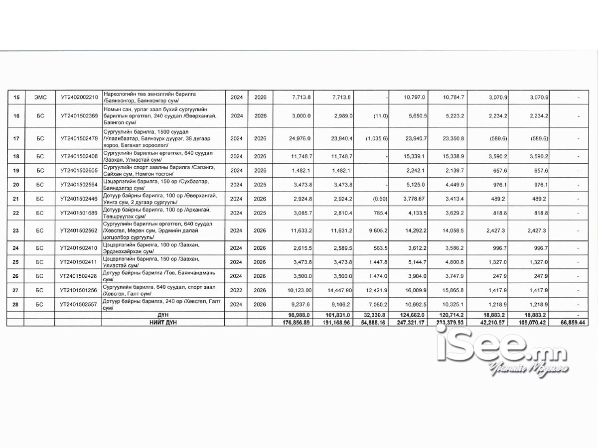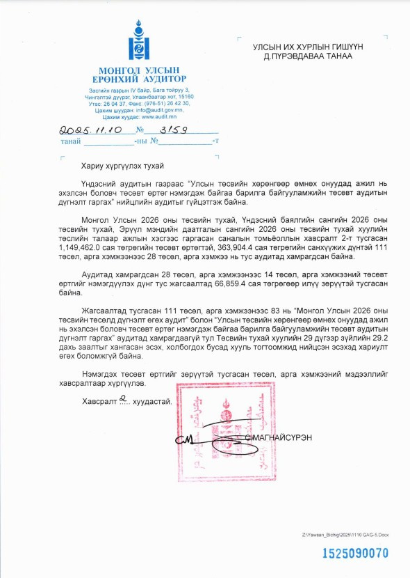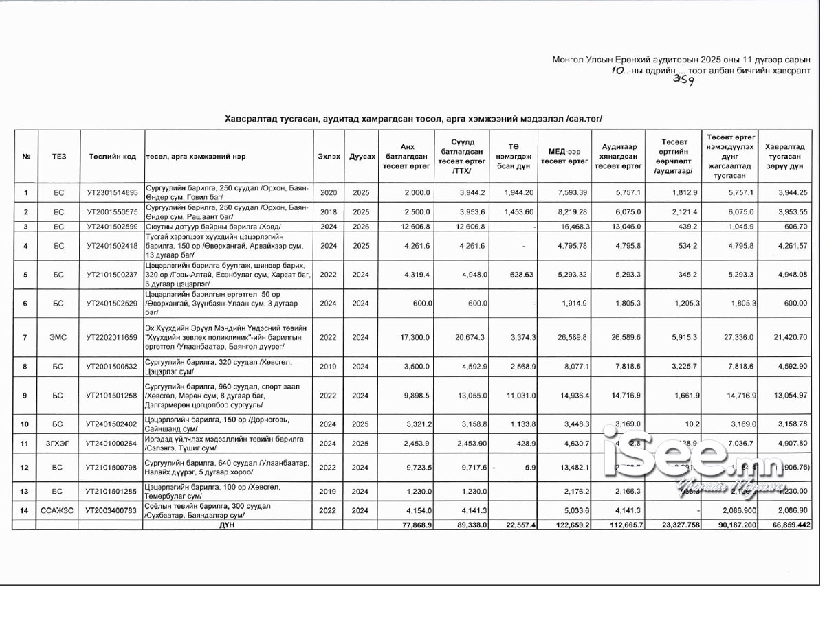 Энэ дагуу парламент өнгөрсөн өдрүүдэд шахуу хуралдаж, өчигдөр /2025.11.10/ 2026 оны төсвийн тухай хуулийн төслүүдийг дөрөв дэх хэлэлцүүлэгт шилжүүлэв. Ирэх оны төсвийн хөрөнгө оруулалтын зардлаас 1.1 их наядыг танаж, 979 тэрбум төгрөгийг багш, эмч нарын цалин, тэтгэврийн нэмэгдэлд зарцуулж байгаа. Тэгвэл Үндэсний аудитын газраас “Улсын төсвийн хөрөнгөөр өмнөх онуудад ажил нь эхэлсэн боловч жилээс жилд төсөв нь нэмэгдээд дуусдаггүй өнөөдрийг хүртэл сунжирч буй барилга байгууламжуудад" аудитын дүгнэлтийг гаргажээ. Ингэхдээ 1.149.462.0 наяд төгрөгийн төсөвт өртөгтэй, 363.904 тэрбум төгрөгийн санхүүжих дүнтэй 111 төсөл, арга хэмжээнээс 28 төсөл, арга хэмжээг тус аудитад хамрагдуулжээ.