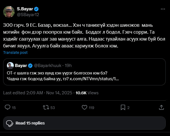 Тэгвэл уг асуудалд Ерөнхий сайд асан С.Баяр цахим сүлжээгээрээ дамжуулан байр сууриа илэрхийлжээ. Тэрбээр "300 гэрч, есөн Ерөнхий сайд. Базар, вокзал… Хэн ч танихгүй хэдэн шинэков мань мэтийн фон дээр попрох юм байх. Боддог л бодол. Гэвч уучлаарай. Та хэдийг саатуулах цаг зав маниуст алга. Надаас тухайлан асуух юм буй бол бичиг явуул. Агуулга байх аваас хариулж болох юм" гэжээ.