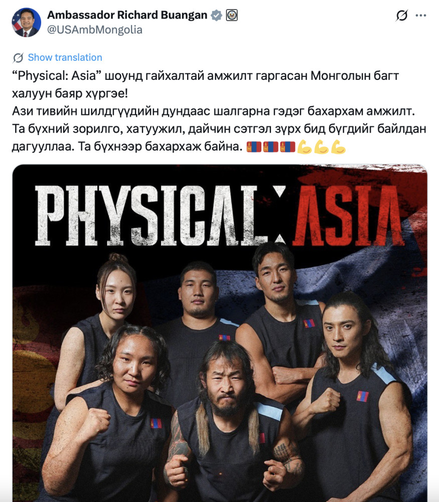Тэгвэл "Netflix"-ийн "Physical Asia" шоу нэвтрүүлэгт амжилттай оролцсон монголын тамирчдад АНУ-аас Монгол Улсад суугаа онц бөгөөд бүрэн эрхт элчин сайд Ричард Буанган өөрийн Х хуудастаа баяр хүргэжээ. Тодруулбал, элчин сайд Ричард Буанган, "Physical: Asia” шоунд гайхалтай амжилт гаргасан Монголын багт халуун баяр хүргэе! Ази тивийн шилдгүүдийн дундаас шалгарна гэдэг бахархам амжилт. Та бүхний зорилго, хатуужил, дайчин сэтгэл зүрх бид бүгдийг байлдан дагууллаа. Та бүхнээр бахархаж байна" гэжээ.