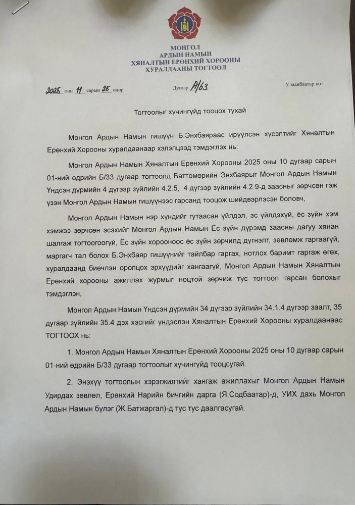 Өнгөрсөн сарын 01-ний өдөр /2025.10.01/ МАН-ын Хяналтын хороо хуралдаж Б.Энхбаярыг МАН-ын гишүүнчлэлээс хассан шийдвэрийг гаргасан.