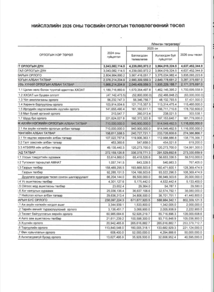 Ирэх оны нийслэлийн төсвийн төслийг НИТХ-аар хэлэлцэж эхэллээ. Нийслэлийн төсөвт 2026 онд 4 их наяд 637.5 тэрбум төгрөгийн орлого төвлөрүүлэхээр төлөвлөсөн бөгөөд энэ нь өнгөрсөн онтой харьцуулахад 398.4 тэрбум төгрөгөөр өссөн дүнтэй байна. Үүний 82.7 хувь буюу 3 их наяд 835.1 тэрбум төгрөгийг татварын орлогоор, үлдсэн 17.3 хувь буюу 802.4 тэрбум төгрөгийг татварын бус орлогоор бүрдүүлэхээр төлөвлөжээ.