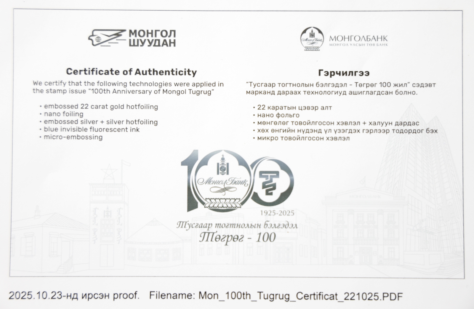 Монголбанк, “Монгол шуудаaн” ХК-тай хамтран үндэсний мөнгөн тэмдэгт төгрөгийг гүйлгээнд гаргасны 100 жилийн ойг тохиолдуулан “Төгрөг-100 жил” маркийг өнөөдөр /2025.12.09/ худалдаанд гаргалаа.