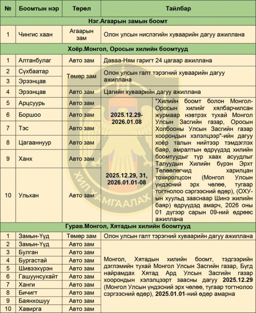 Монгол, Оросын Арцсуурь, Боршоо, Тэс авто замын боомтууд 2025.12.29-2026.01.08-ны өдрүүдэд амарна. Монгол, Хятадын Замын-Үүд, Булган, Бургастай, Шивээхүрэн, Гашуунсухайт, Ханги, Бичигт, Баянхошуу, Хавирга авто замын боомтууд 2025.12.29 болон 2025.01.01-ний өдөр амарна.
