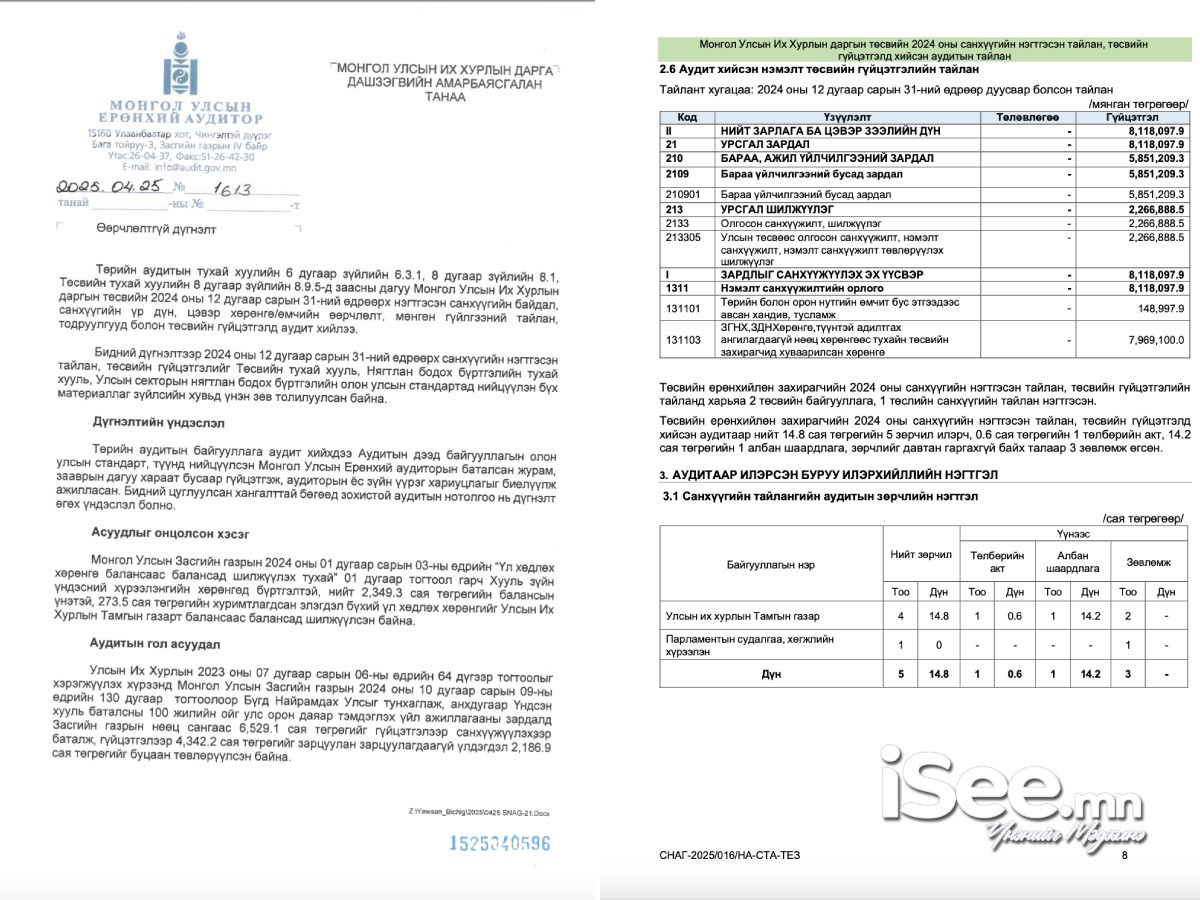 Тэгвэл Аудитын байгууллагаас 2024 оны төсвийн ерөнхийлөн захирагчдын тайланд аудит хийсэн байна. Ингэхэд УИХ-ын дарга асан Д.Амарбаясгалан нь Бүгд Найрамдах Улсыг тунхаглаж, анхдугаар Үндсэн хууль баталсны 100 жилийн ойг улс орон даяар тэмдэглэх үйл ажиллагааны зардалд Засгийн газрын нөөц сангаас 4.3 тэрбум төгрөгийг зарцуулсан байсан гэдгийг дүгнэсэн байна.