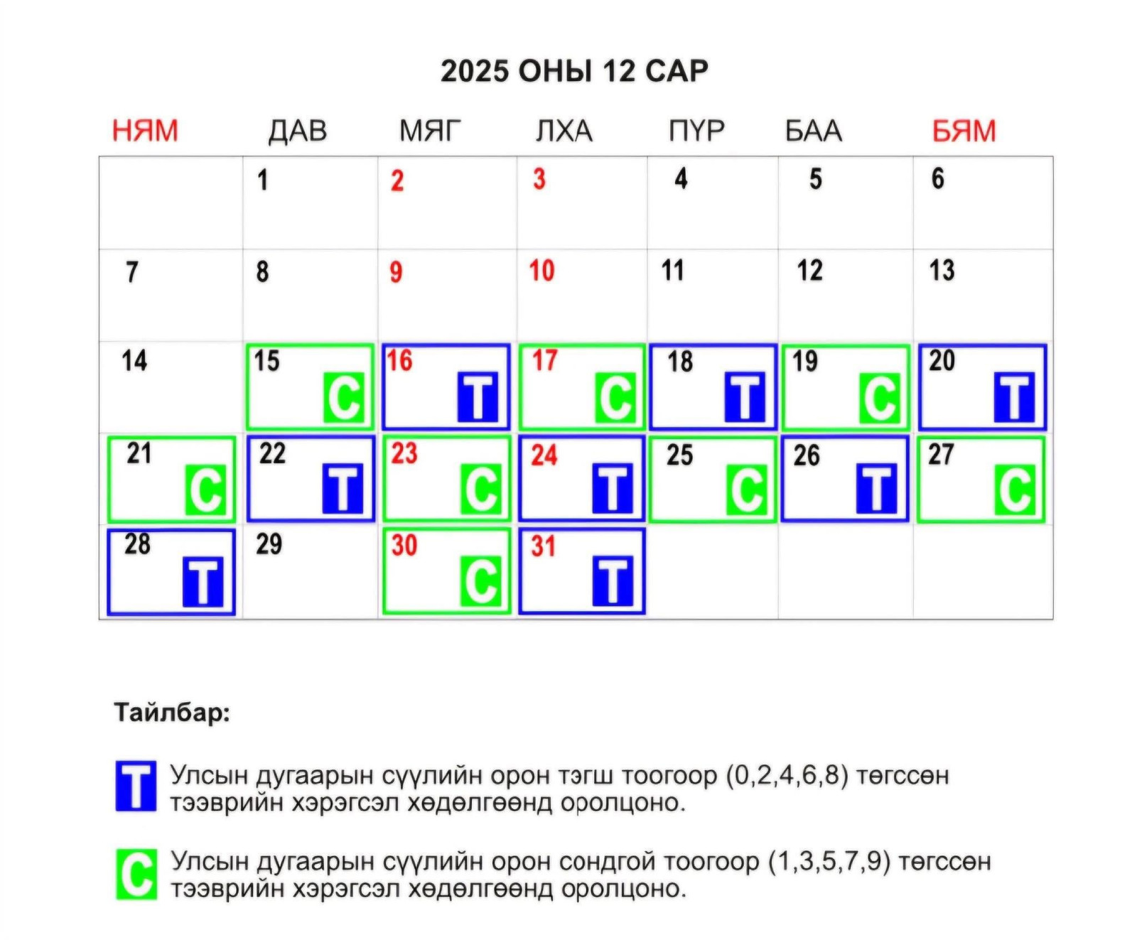 Тэгвэл Автомашины улсын дугаарын тэгш, сондгой хязгаарлалт хийх талаар ТЦА, ЗХУТ-өөс мэдээлэл өгөв. Маргаашаас буюу 12-р сарын 15-31-ний өдрөөс эхлэн 08:00-20:00 цагийн хооронд бүсчлэл хамаарахгүйгээр тэгш, сондгойгоор хөдөлгөөнд оролцохоор болжээ. Мөн маргааш буюу 15-ны даваа гарагт сондгой тоогоор төгссөн улсын дугаартай автомашинууд замын хөдөлгөөнд оролцоно.