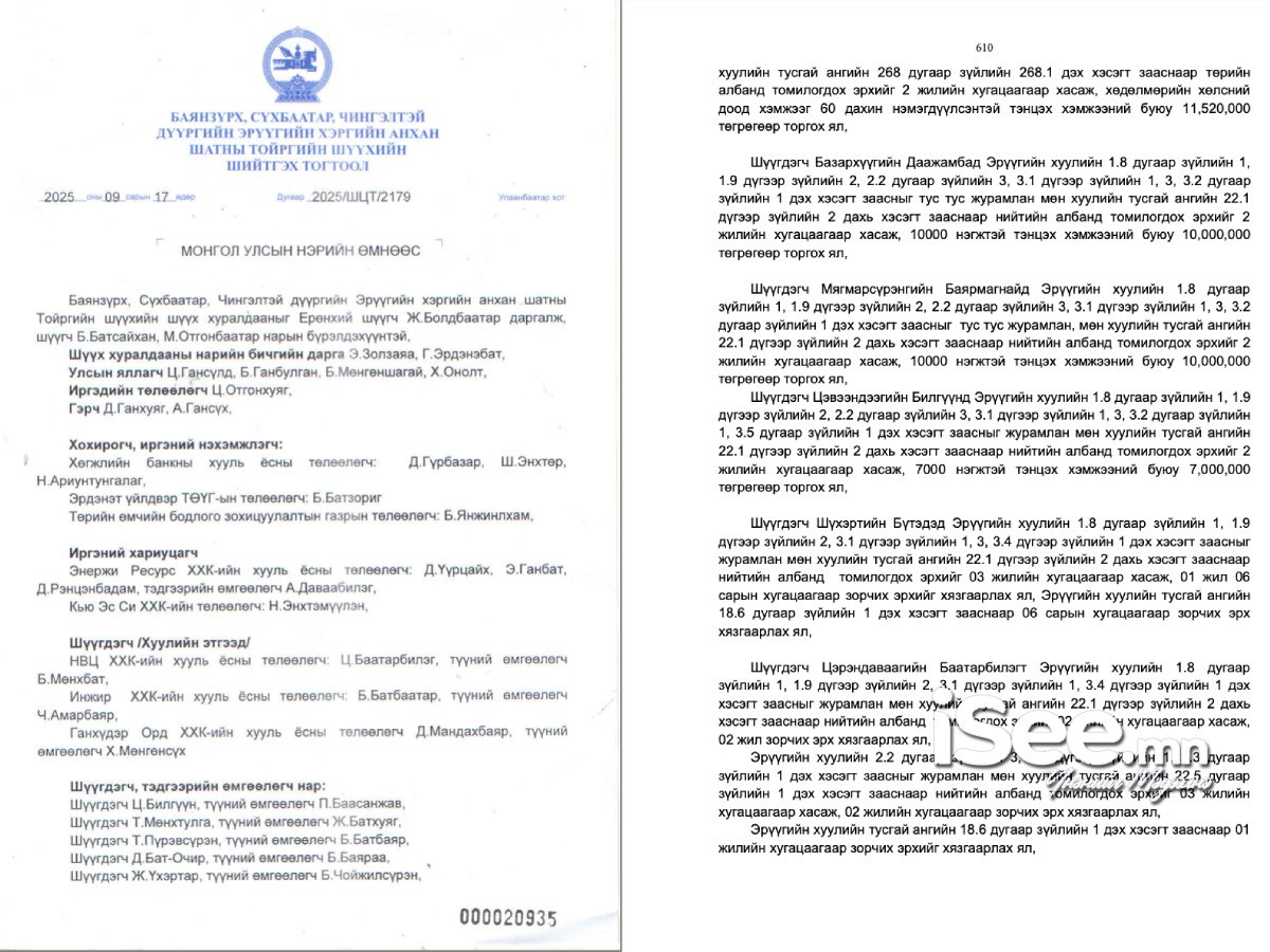 Эрүүгийн хуулийн тусгай ангийн 22.1 дүгээр зүйлийн 2 дахь хэсэгт зааснаар нийтийн албанд томилогдох эрхийг хоёр жилийн хугацаагаар хасаж, 10 мянган нэгжтэй тэнцэх хэмжээний буюу 10 сая төгрөгөөр торгох ял оноосон юм. Шүүхээс тогтоосон хугацаанд торгох ялыг биелүүлээгүй бол биелэгдээгүй торгох ялын 15 нэгжтэй тэнцэх хэмжээний буюу 15 мянган төгрөгийг нэг хоногоор тооцож хорих ялаар солих болохыг анхааруулсан байдаг. Мөн эрх хасах нэмэгдэл ялыг тэдэнд ял оногдуулсан үеэс тоолсугай хэмээн анхан шатны шүүхээс алх цохиж байжээ.