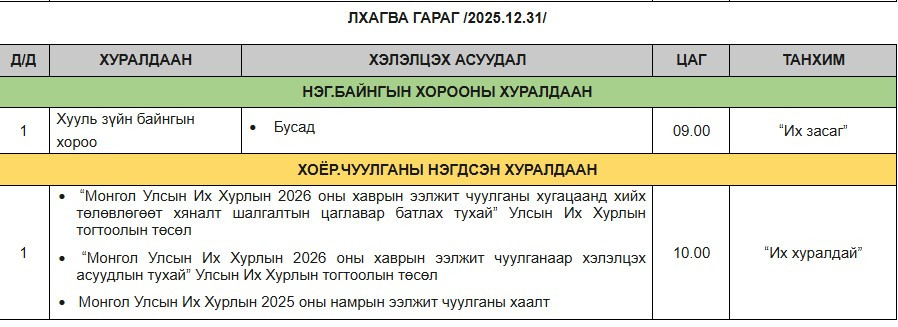 Энэ өдөр 31-ний өдөр таарч буй учир ийнхүү завсарлуулахаар болжээ. Тус өдөр Хууль зүйн байнгын хороо хуралдахаас гадна чуулганы хуралдаанаар "2026 оны хаврын ээлжит чуулганы хугацаанд төлөвлөгөөт хяналт шалгалтын цаглавар батлах тухай" УИХ-ын тогтоолын төсөл, "УИХ-ын 2026 оны хаврын ээлжит чуулганаар хэлэлцэх асуудлын тухай" УИХ-ын тогтоолын төсөл, намрын чуулганы хаалт зэргийг хэлэлцэхээр товложээ.