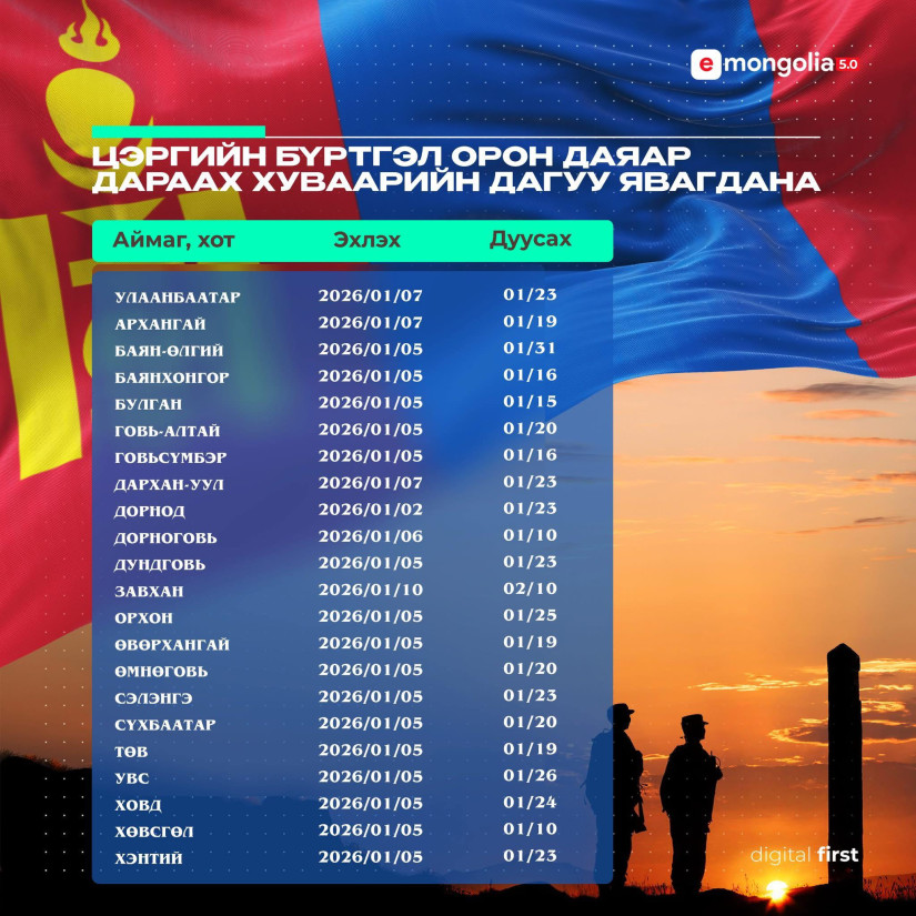 Жил бүрийн нэгдүгээр сард улс орон даяар цэргийн шинэчилсэн бүртгэл явагддаг билээ. Тэгвэл энэ жилийн тухайд, нэгдүгээр сарын 7-23-ны хооронд явагдахаар болжээ.