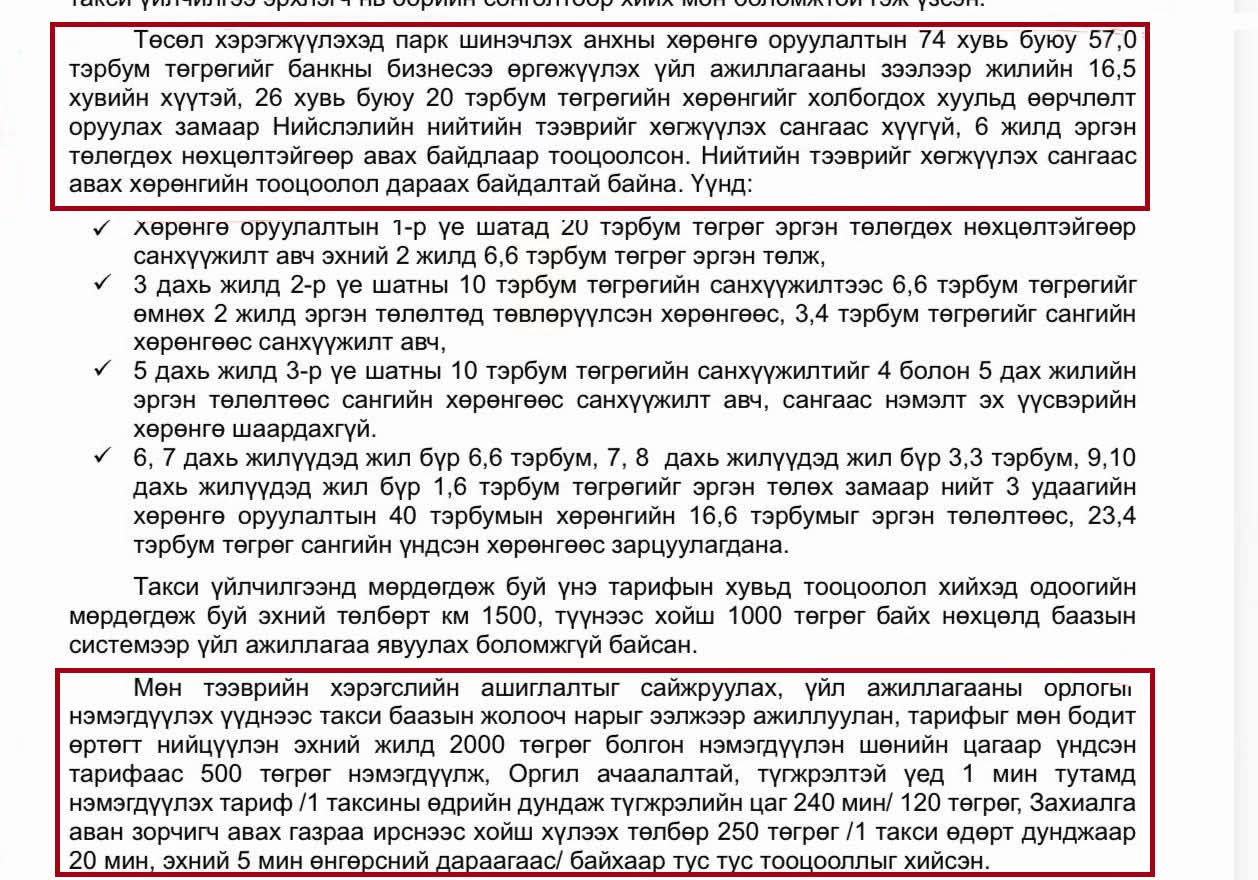 Хотын дарга Х.Нямбаатарын санаачилсан Улаанбаатар хотын такси үйлчилгээг төр, хувийн хэвшлийн түншлэлээр сайжруулах тухай төсөлд дурдсанаар цахилгаан хөдөлгүүртэй 2000 автомашиныг таван жилийн хугацаанд авч, нэгдсэн удирдлагын системд холбож, үйлчилгээнд явуулна. Ингэхдээ нийслэлээс нийт 77 тэрбум төсөвлөсөн байх бөгөөд 74 хувь буюу 56 тэрбум төгрөгийг 16.5 хувийн хүүтэй бизнесийн зээлээр авахаар тооцож, 26 хувийн санхүүжилтийг нь буюу 21 тэрбум төгрөгийг Нийслэлийн нийтийн тээврийг хөгжүүлэх сангаас хүүгүй, 6 жилийн хугацаанд эргэн төлөгдөх нөхцөлтэйгөөр зээлэхээр уг төсөлд тусгасан. Дэлгэрэнгүй мэдээллийг ЭНД ДАРЖ уншина уу.