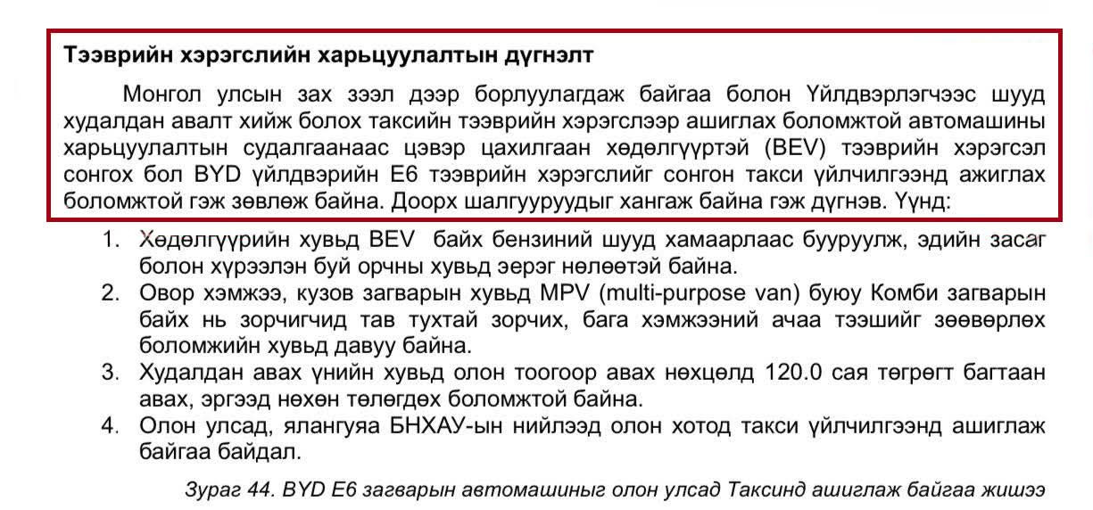 Тэгвэл “Улаанбаатар хотын такси үйлчилгээг сайжруулах” ТЭЗҮ-г Нийслэлийн ЗДТГ, “Улаанбаатар хөгжлийн корпораци” ХХК нар хамтран боловсруулсан байна. Энд дурдсанаар такси үйлчилгээнд явуулах тээврийн хэрэгслээрээ цахилгаан хөдөлгүүртэй BYD E6 загварын автомашиныг хамгийн тохиромжтой гэж үзжээ. Тэгэхээр энд ямар ч сонгон шалгаруулалт болохгүй бөгөөд төслийг санаачлахдаа л такси үйлчилгээнд ямар улсын, ямар компанийн, ямар автомашиныг явуулахаа тогтчихсон байсан байж магадгүй байна.