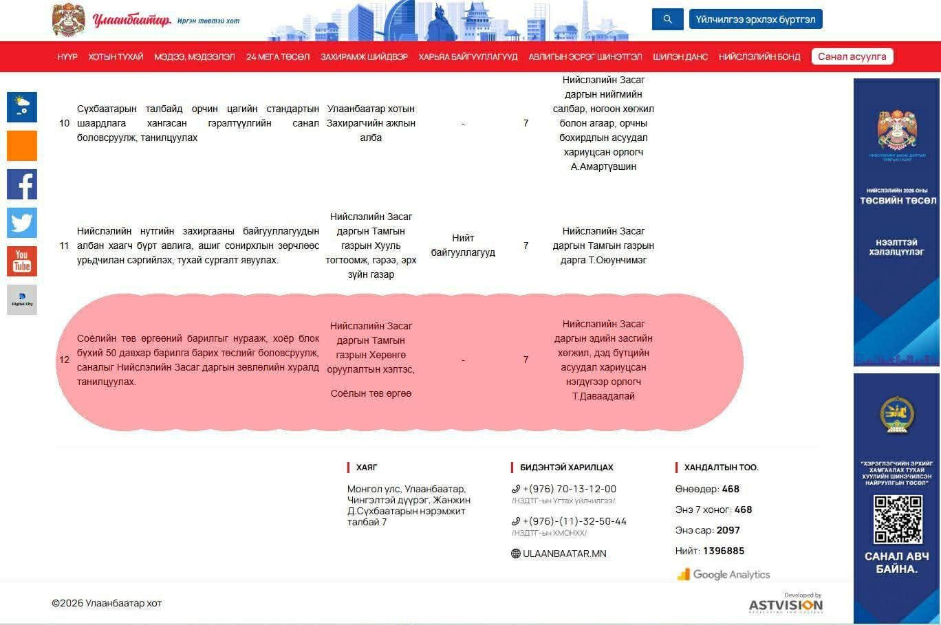 Тус ажлыг Нийслэлийн Засаг даргын Эдийн засгийн хөгжил, дэд бүтцийн асуудал хариуцсан нэгдүгээр орлогч Т.Даваадалай хариуцаж байгаа аж. Түүнчлэн өчигдөр энэ асуудал цахим орчинд цацагдаж, олны анхаарлыг татаж эхэлсэнтэй зэрэгцэн ulaanbaatar.mn сайт дээр байршсан уг мэдээллээс 12 дахь хэсгийг нь өнөөдөр хасжээ.