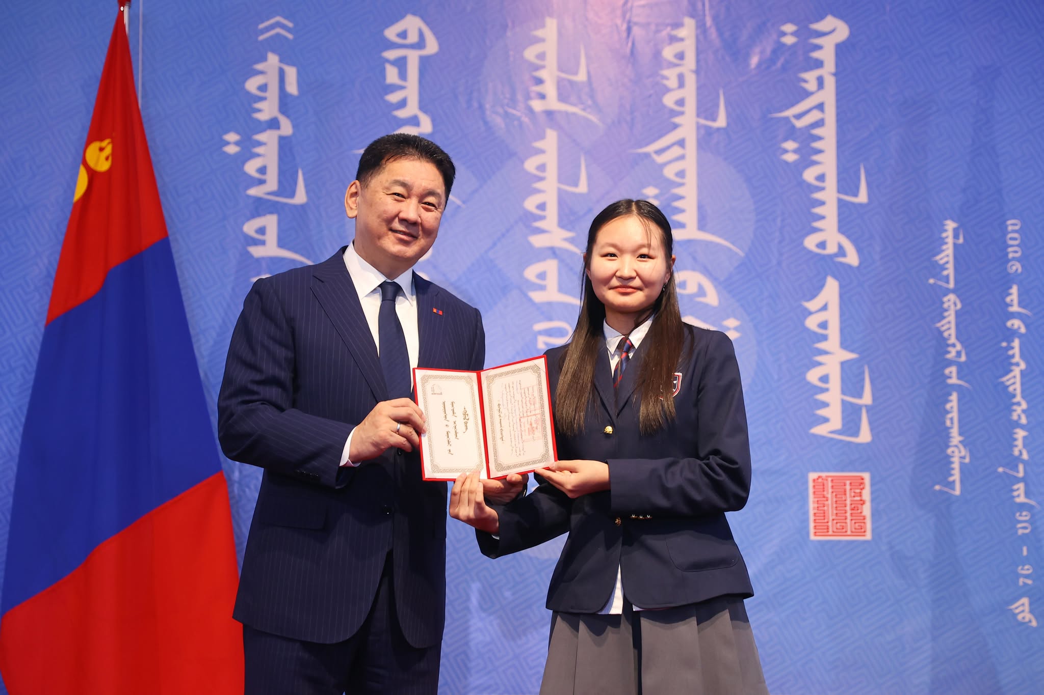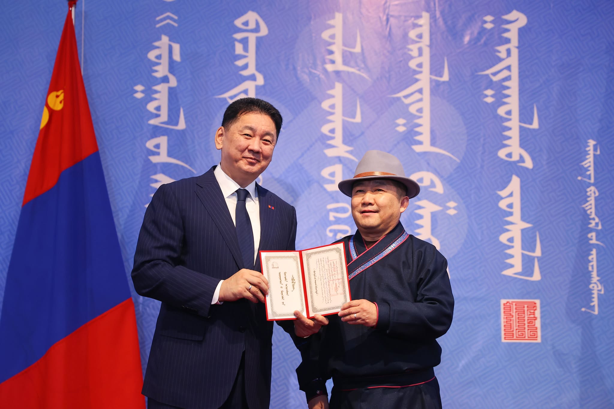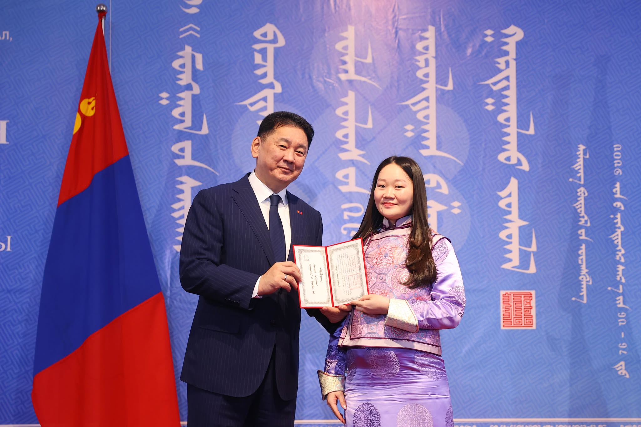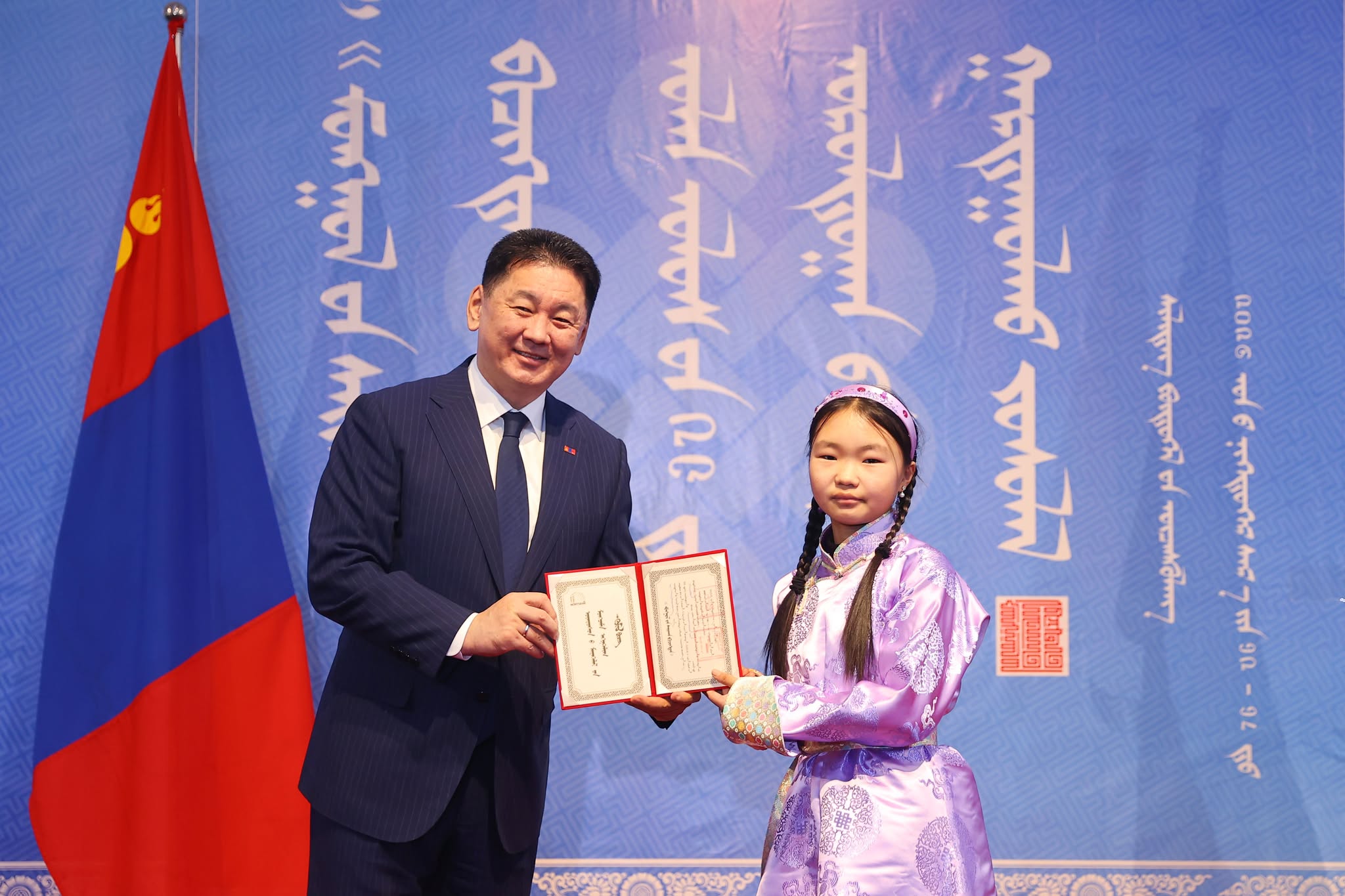 Уран зургийн галерейд болсон шагнал гардуулах ёслол, шилдэг бүтээлийн үзэсгэлэнгийн нээлтэд Монгол Улсын Ерөнхийлөгч Ухнаагийн Хүрэлсүх оролцож, уралдааны ангилал бүрт тэргүүн байр эзэлсэн эрхмүүдэд шагналыг нь  гардуулан баяр хүргэж, амжилт хүсэн ерөөлөө.  Тэр бээр, монгол бичиг бол монгол туургатны эв нэгдлийн бэлгэдэл, эрдэм соёлын их өв сан, тусгаар тогтнол, төрт ёсны эрхэм гэрч, мянган жилийн түүхтэй оюуны түлхүүр, хүн төрөлхтний оюуны соёлын гайхамшигт өв гэдгийг тодотголоо.