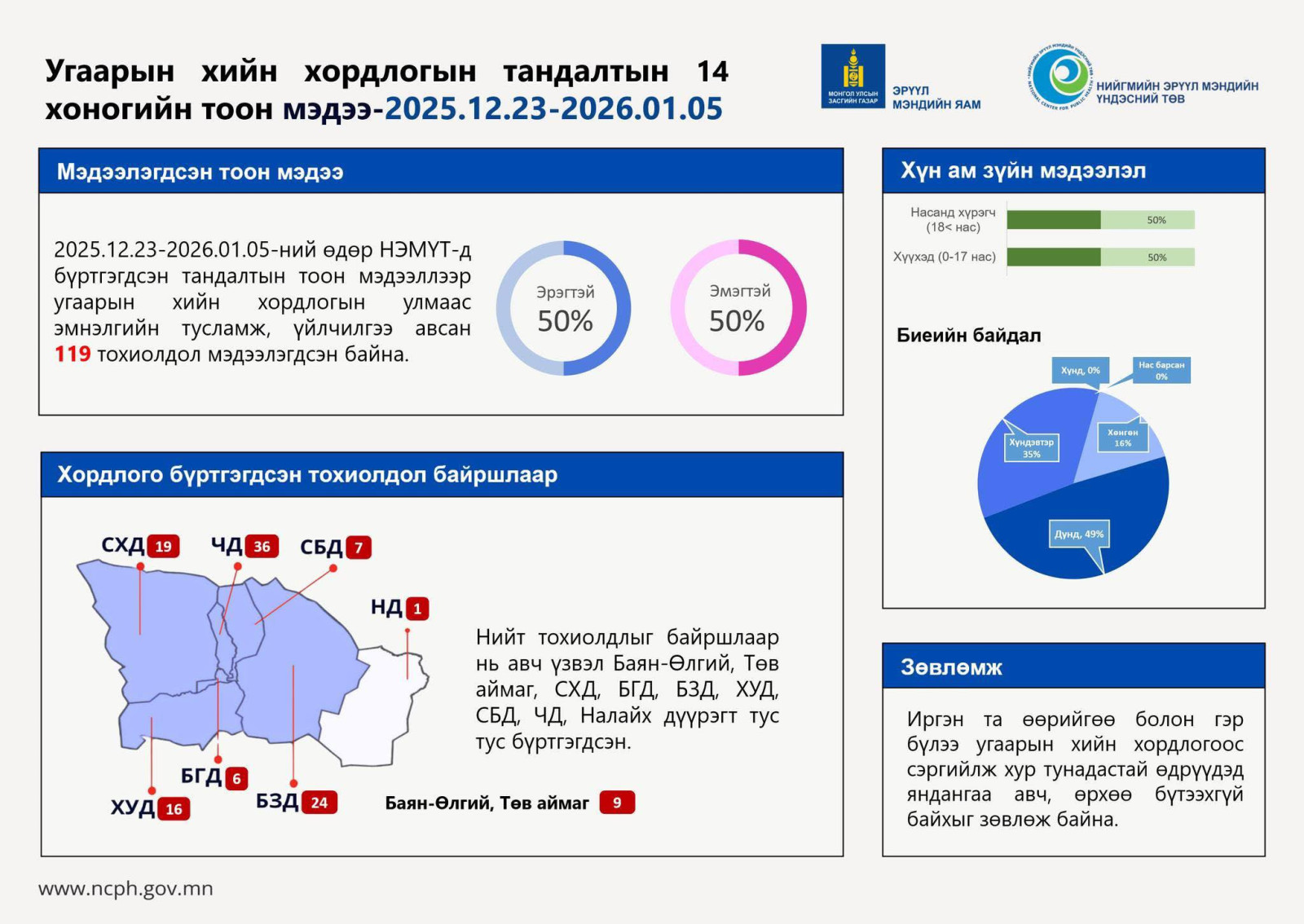 Нийгмийн эрүүл мэндийн үндэсний төв /НЭМҮТ/-ийн мэдээллээр өнгөрсөн 14 хоногийн хугацаанд /2025.12.23-2026.01.05/ угаарын хийн хордлогын улмаас 119 хүн эмнэлгийн тусламж үйлчилгээ авсан байна.