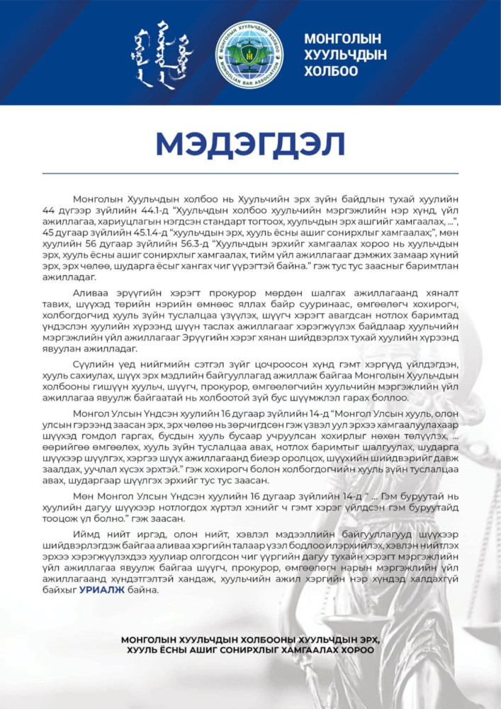 Монголын хуульчдын холбооноос мэдэгдэл гаргажээ.