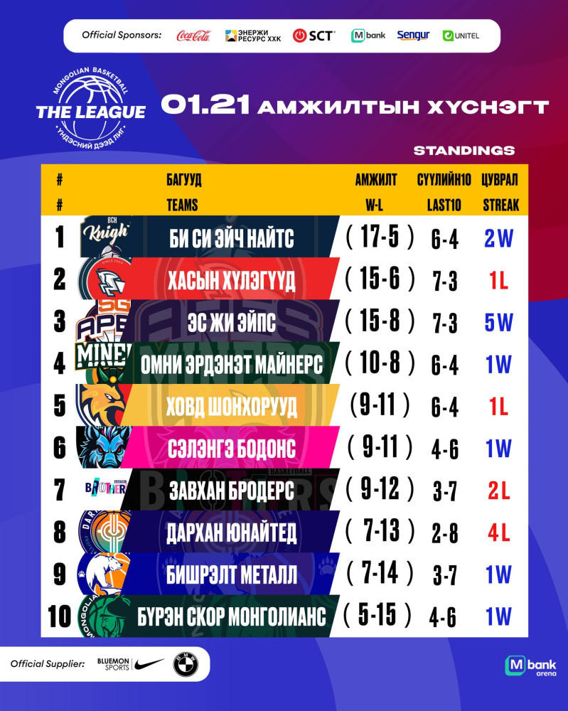 Өчигдрийн тоглолтод “Сэлэнгэ бодонс” баг “Завхан бродерс” багийг 79-74-өөр хожиж ес дэх хожлоо авлаа. Ингэснээр “Сэлэнгэ бодонс” баг плэй-оффт үлдэх боломжоо хадгалж үлдлээ. 5-8-р байрт бичигдэж буй багууд тун ойр үзүүлэлттэй байна. Хүснэгтийг “Би Си Эйч Найтс” баг 17 хожилтойгоор тэргүүлсэн хэвээр байгаа бол “Хасын хүлэгүүд”, “Эс Жи Эйпс” багууд 15 хожилтойгоор удаалж байна. 4-7-р байрт бичигдэж буй багууд тун ойр хожилтой явна. Энэ амралтын өдрүүдэд дөрвөн тоглолт болох хуваарь гарчээ.