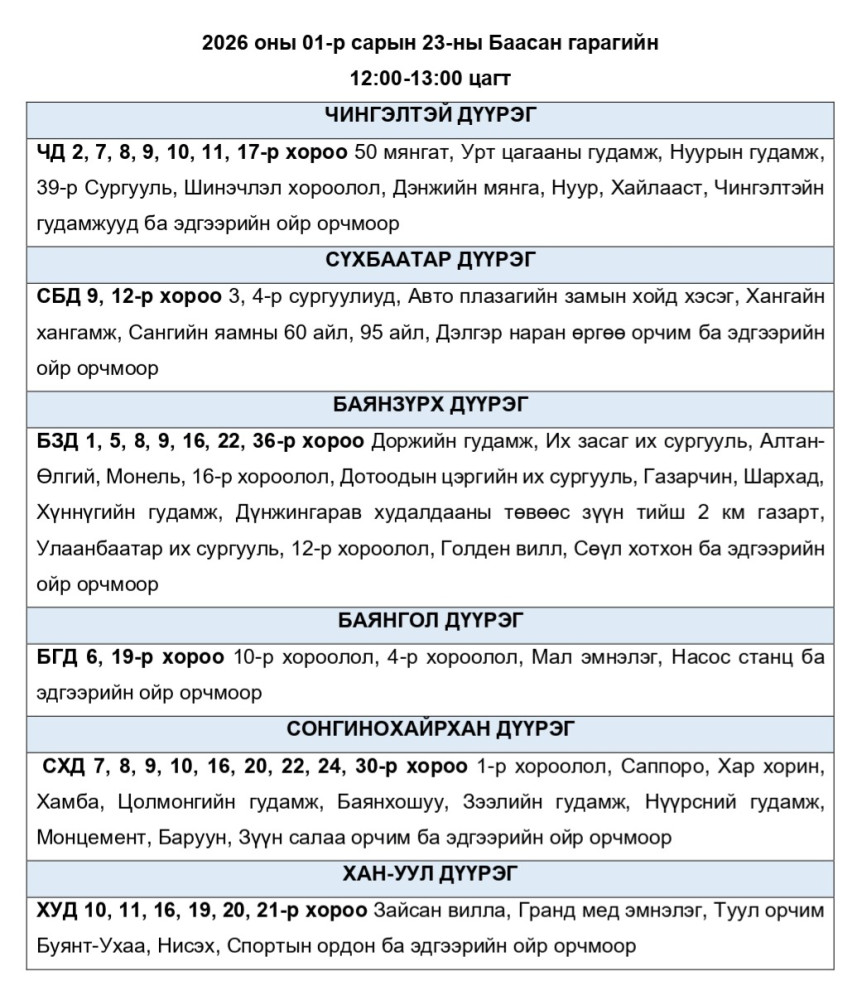 Эрчим хүчний чадлын дутагдлаас шалтгаалан 2026 оны 01-р сарын 23-ны баасан гарагт цахилгаан эрчим хүчний “Хязгаарлалт хийж болзошгүй" байршлуудын хуваарийг Улаанбаатар цахилгаан түгээх станц ТӨХК-аас танилцууллаа.